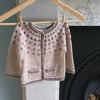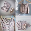 The cardigan is worked flat, seamlessly from the top down. The colourwork yoke is worked from a chart or written instructions. Stitches are held for sleeves and knitting continues on the body. Sleeves are worked in the round from the top down. Stitches are picked up along both fronts and across the back neck to work buttonbands in the round.