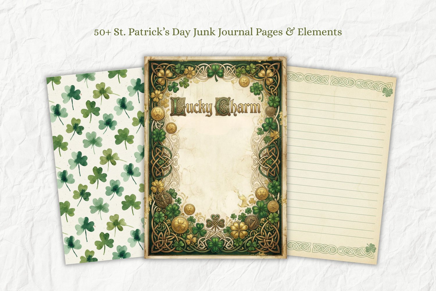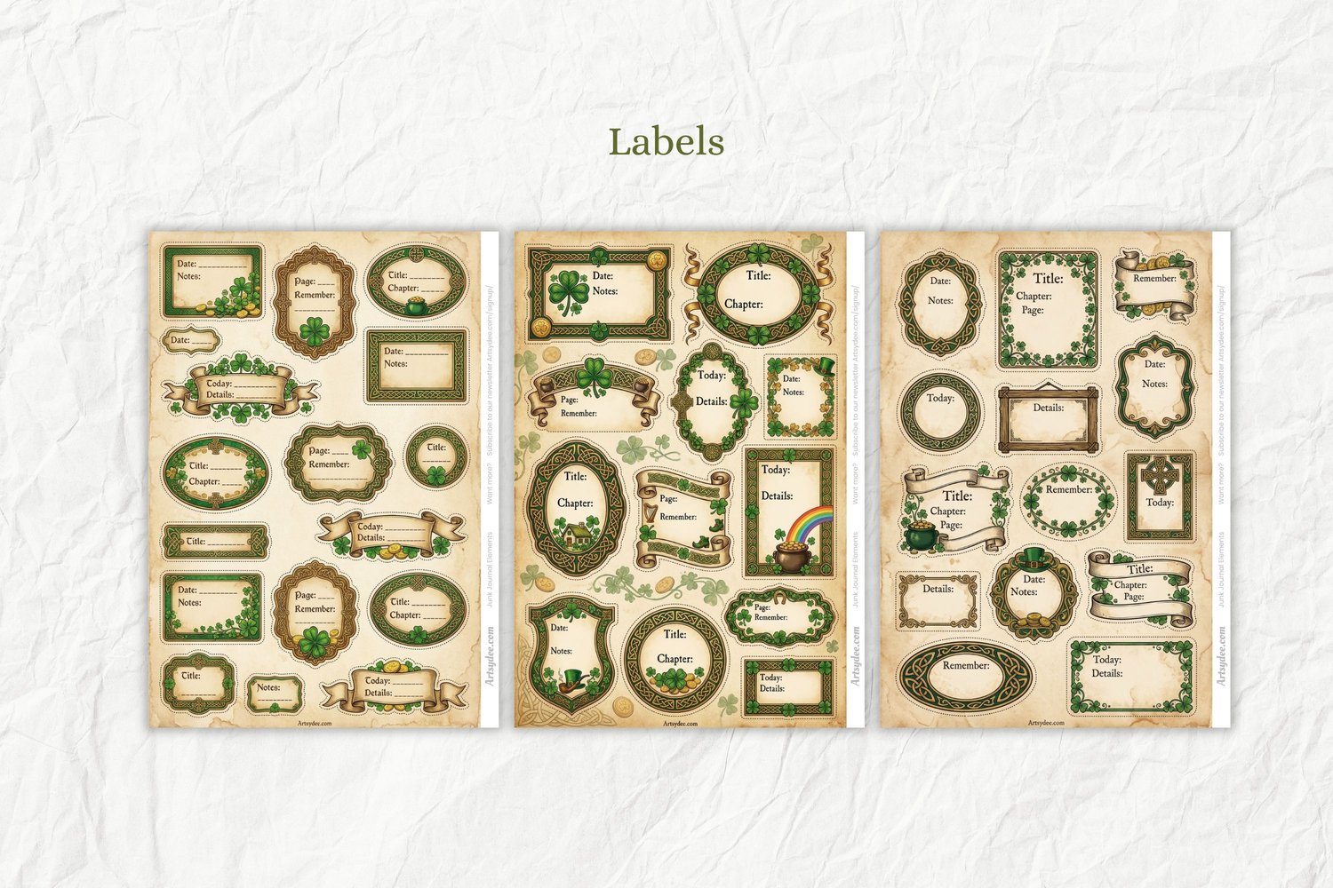 Bring a little Irish magic to your junk journal with this 53-page St. Patrick's Day printable kit — packed with Celtic-inspired backgrounds, vintage ephemera, lucky charm stickers, labels, fussy cuts, patterned papers, and so much more.
