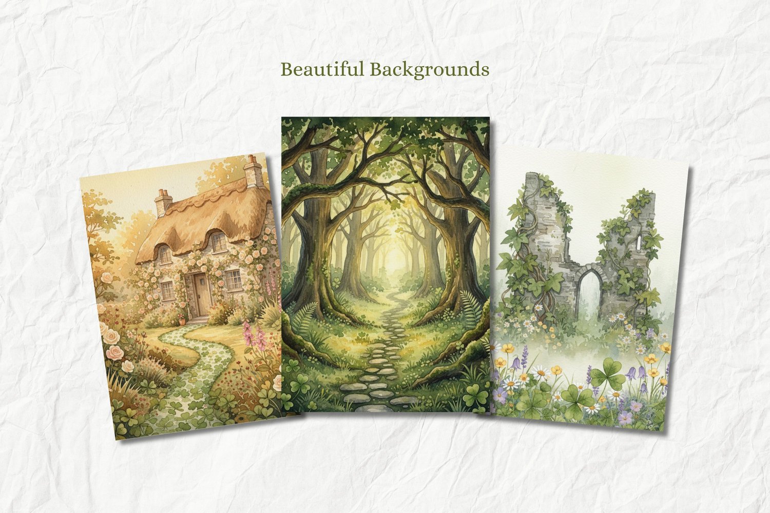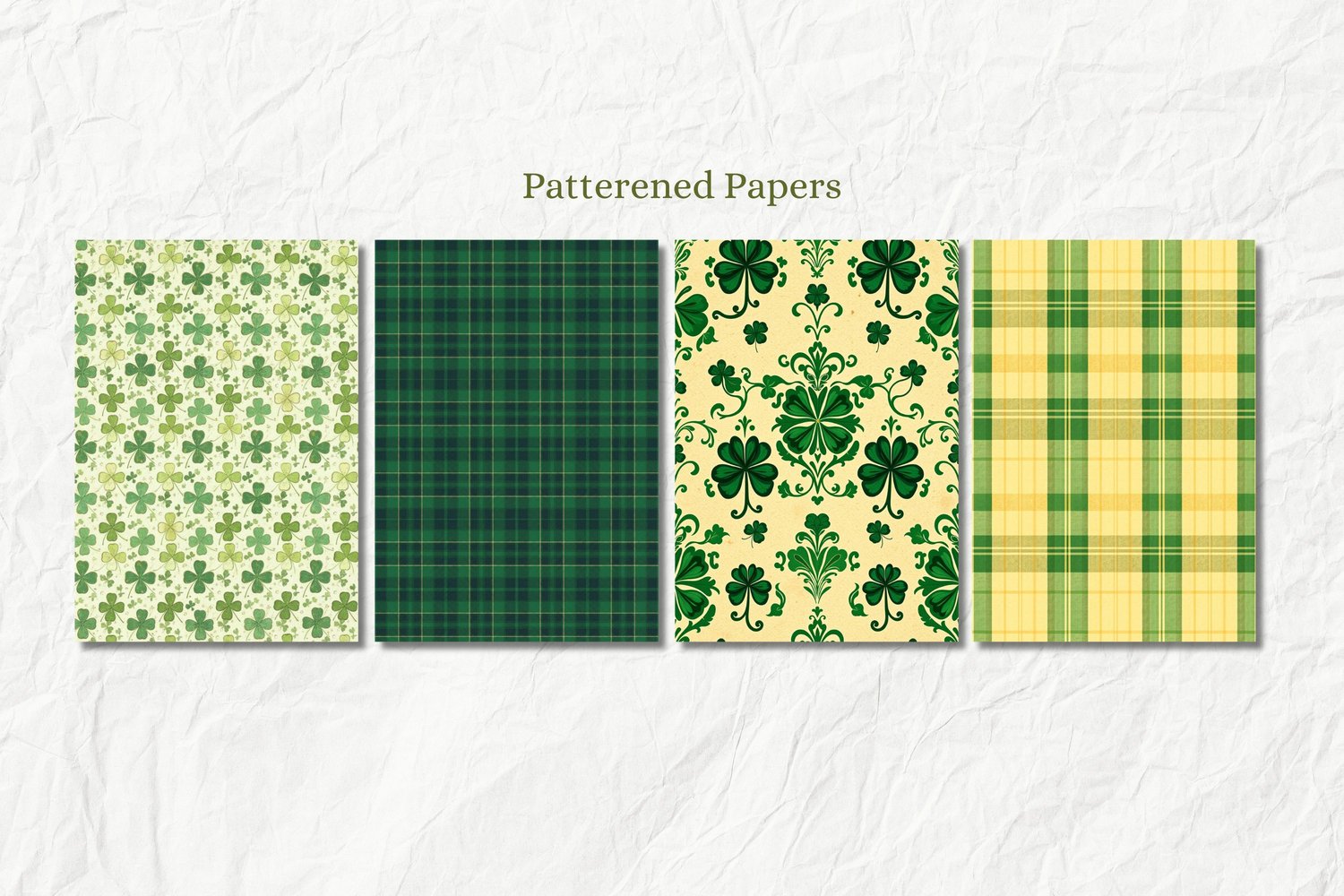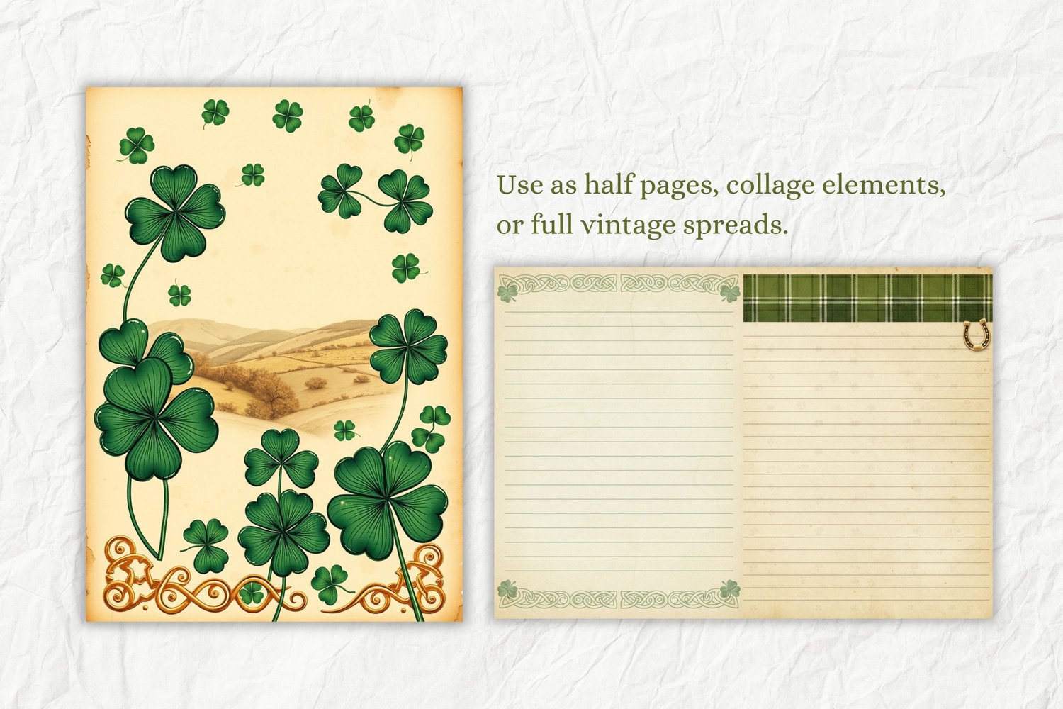 • Background scenes and patterned papers — Celtic knotwork designs, shamrock prints, plaid patterns, and vintage-style scenic pages