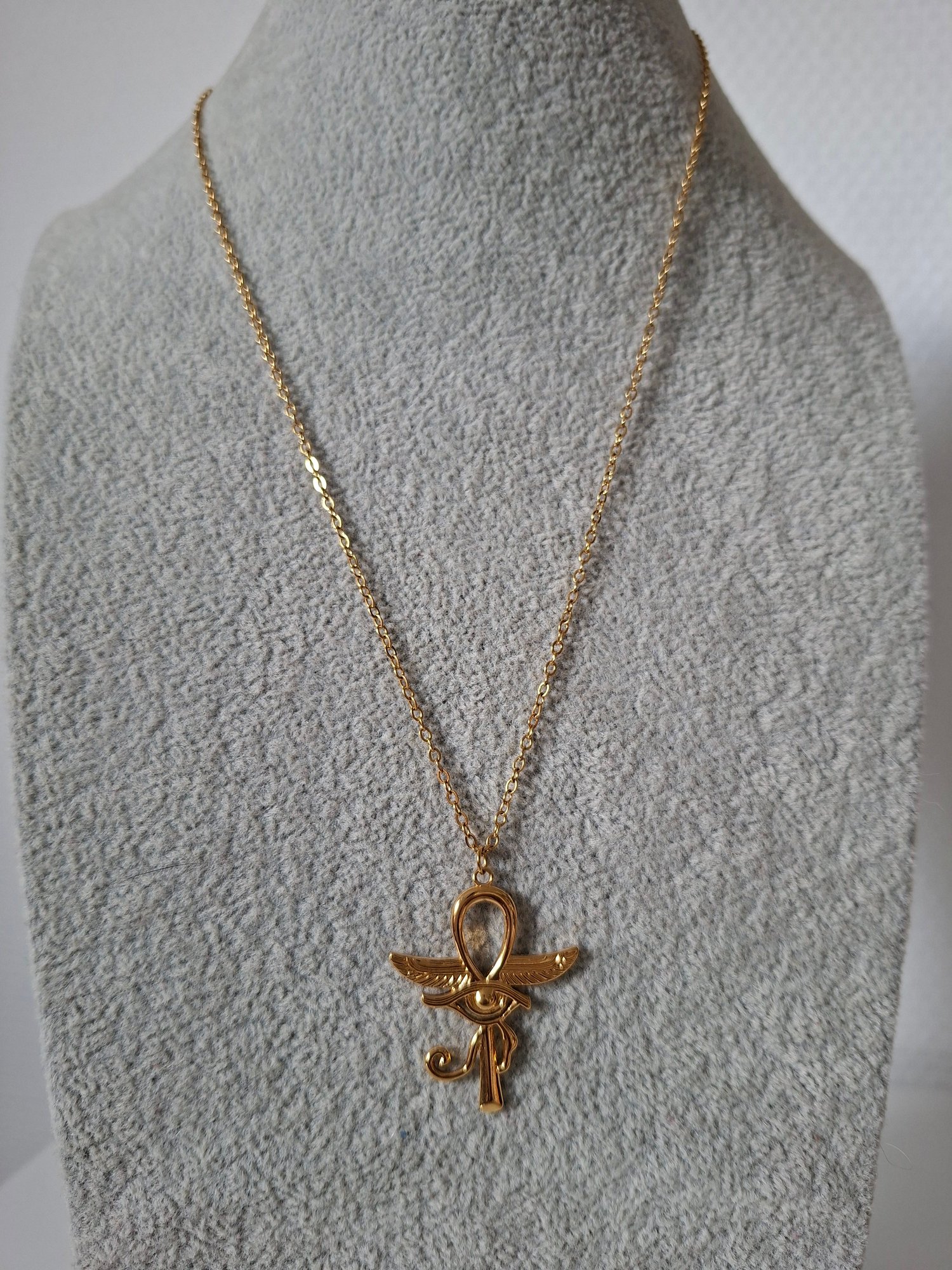 Un collier puissant et symbolique qui rend hommage à la sagesse des anciens Égyptiens. Son pendentif doré représente l’ankh ailé et l’œil d’Horus, deux symboles sacrés d’éternité, de protection et de clairvoyance. Une pièce forte qui associe élégance et spiritualité.