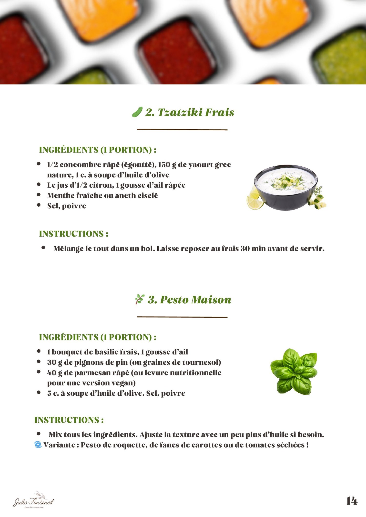 - 🥣 5 recettes de sauces et tartinades maison : houmous, tzatziki, pesto, yaourt curry, lentilles corail