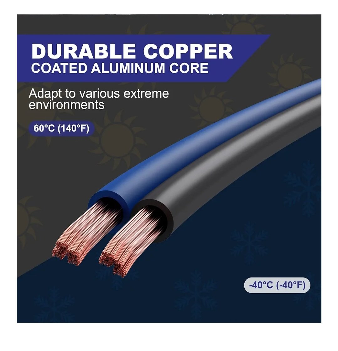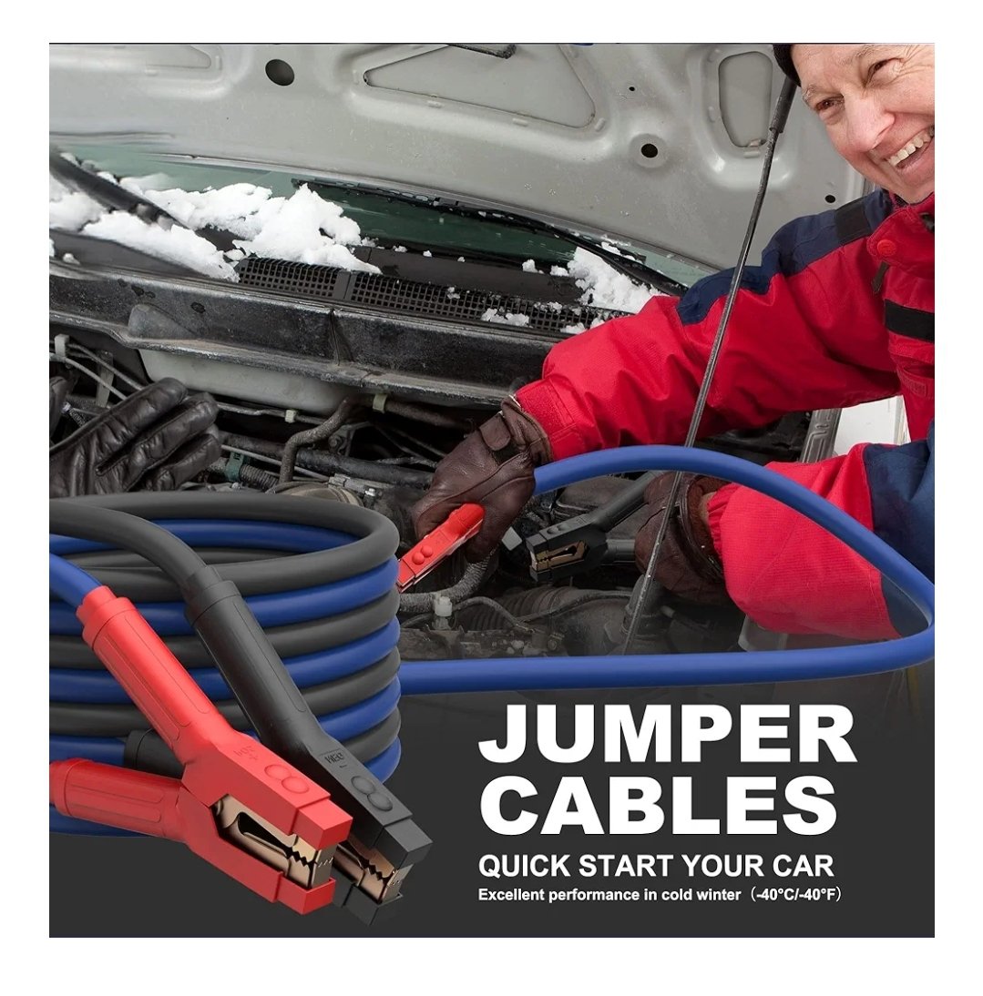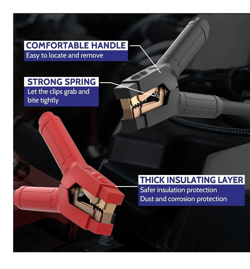 PREMIUM FLEXIBLE CABLE - High density copper clad aluminum ensures excellent electrical conductivity. The car jumper cables remain flexible even in cold winters. The patented design of the clip with solid serrated teeth and spring is stronger than others.