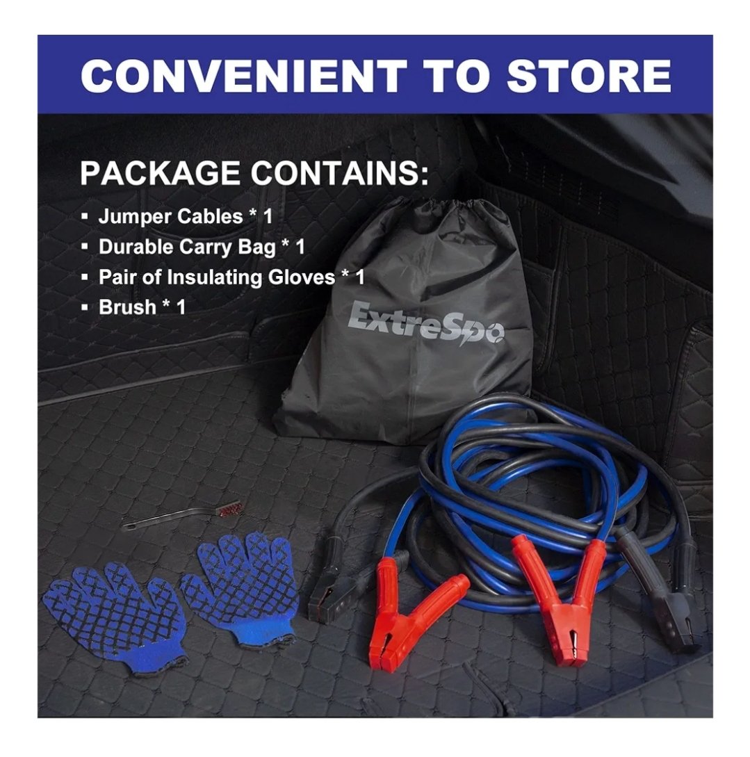 2 YEARS UNCONDITIONAL SERVICE- In addition to 0 Gauge 25 FT Jumper Cables×1, you will also get: Carrying Case×1, Gloves×1, Brushes×1. ExtreSpo jumper cables kit for car provides 2 years after-sales service. Please feel free to contact us if you have any quesManufacturer ExtreSpo