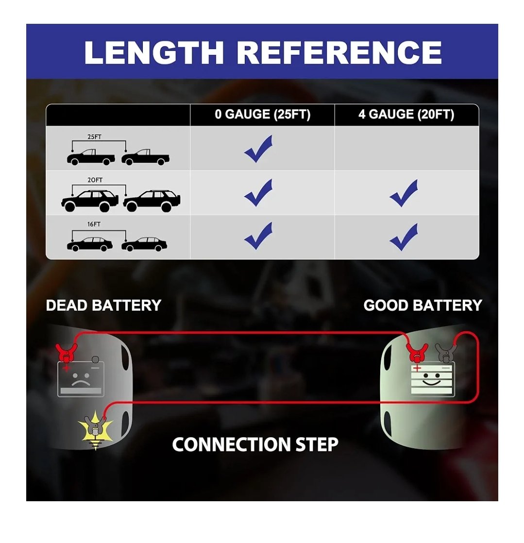 25 FEET JUMPER CABLES - These battery jumper cables are 25 feet long and easily connect from one car battery to another without tangling.