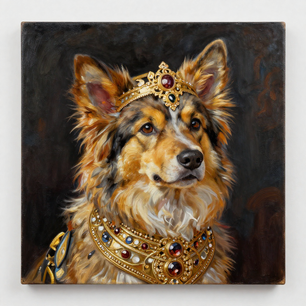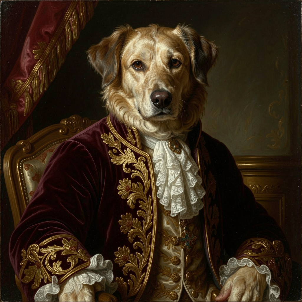 This Royal Dog Portrait transforms your pet into an elegant baroque-style painting inspired by classic European art. Perfect for home decor, gifts, or pet lovers.