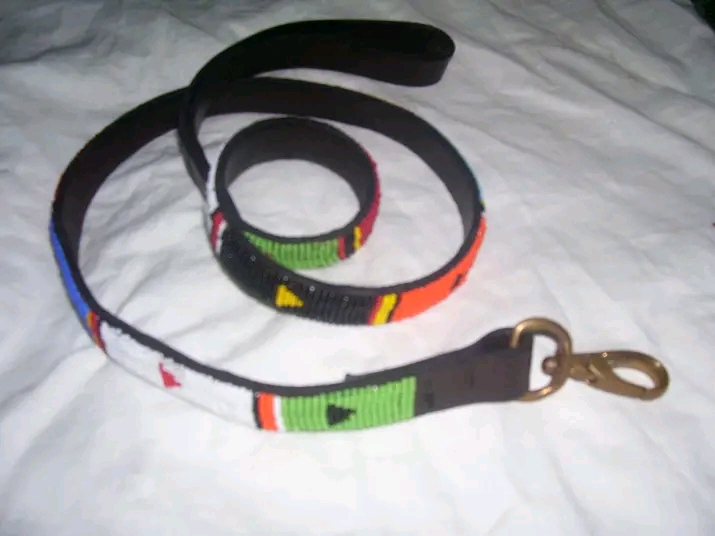 High-quality beaded leather dog Leashes. Beads are sewn into leather making very beautiful patterns. High-quality leather and beadwork finishing. brass buckles. Available in primary colors, secondary colors, and earthly colors e.g. Brown.