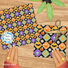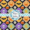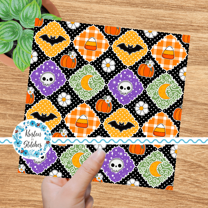 Colorful Halloween patchwork with skulls, bats, pumpkins, flowers and candy corn.