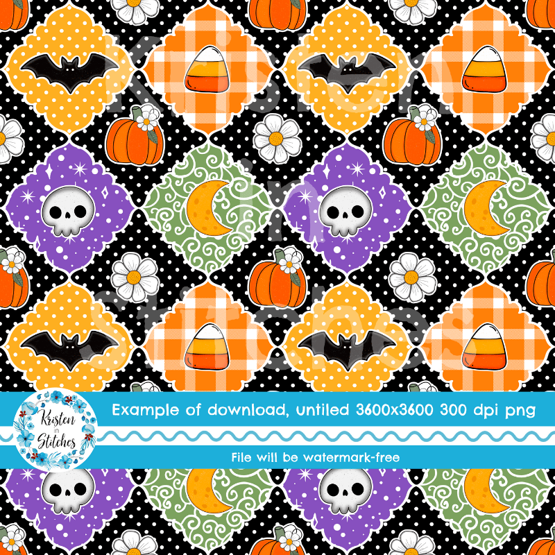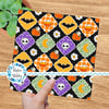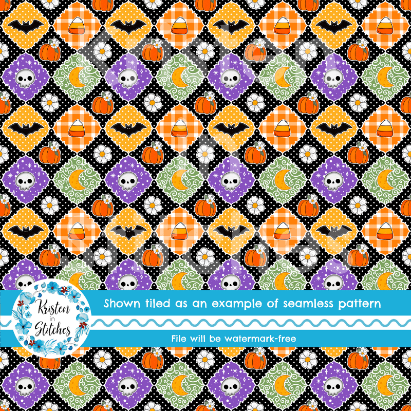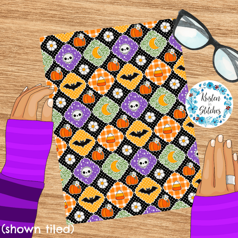 Colorful Halloween Haunts Spooky Bats Skulls Sweet Pumpkins Candy Corn Patchwork Seamless Pattern