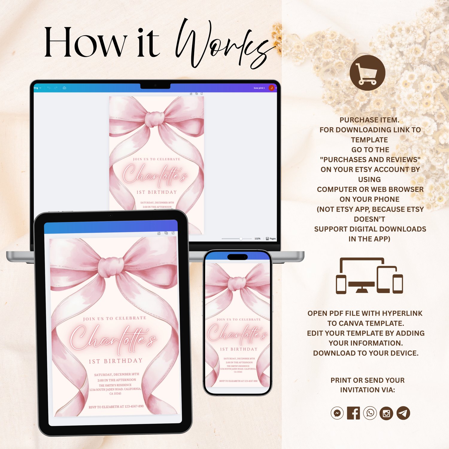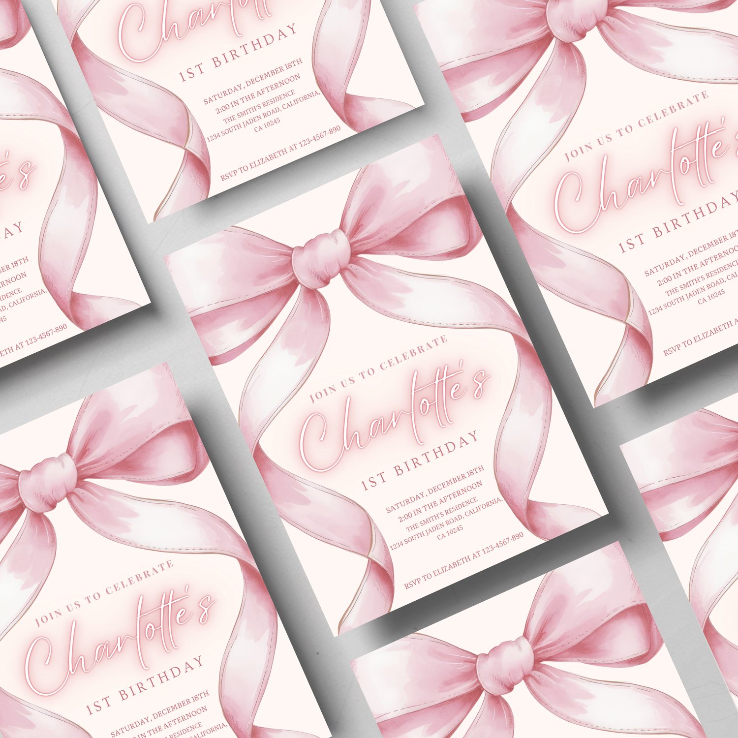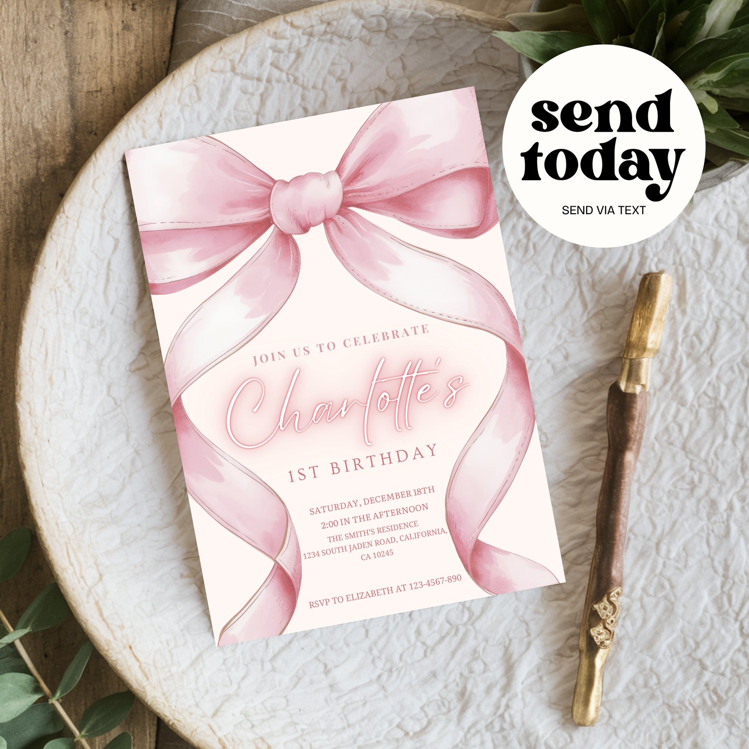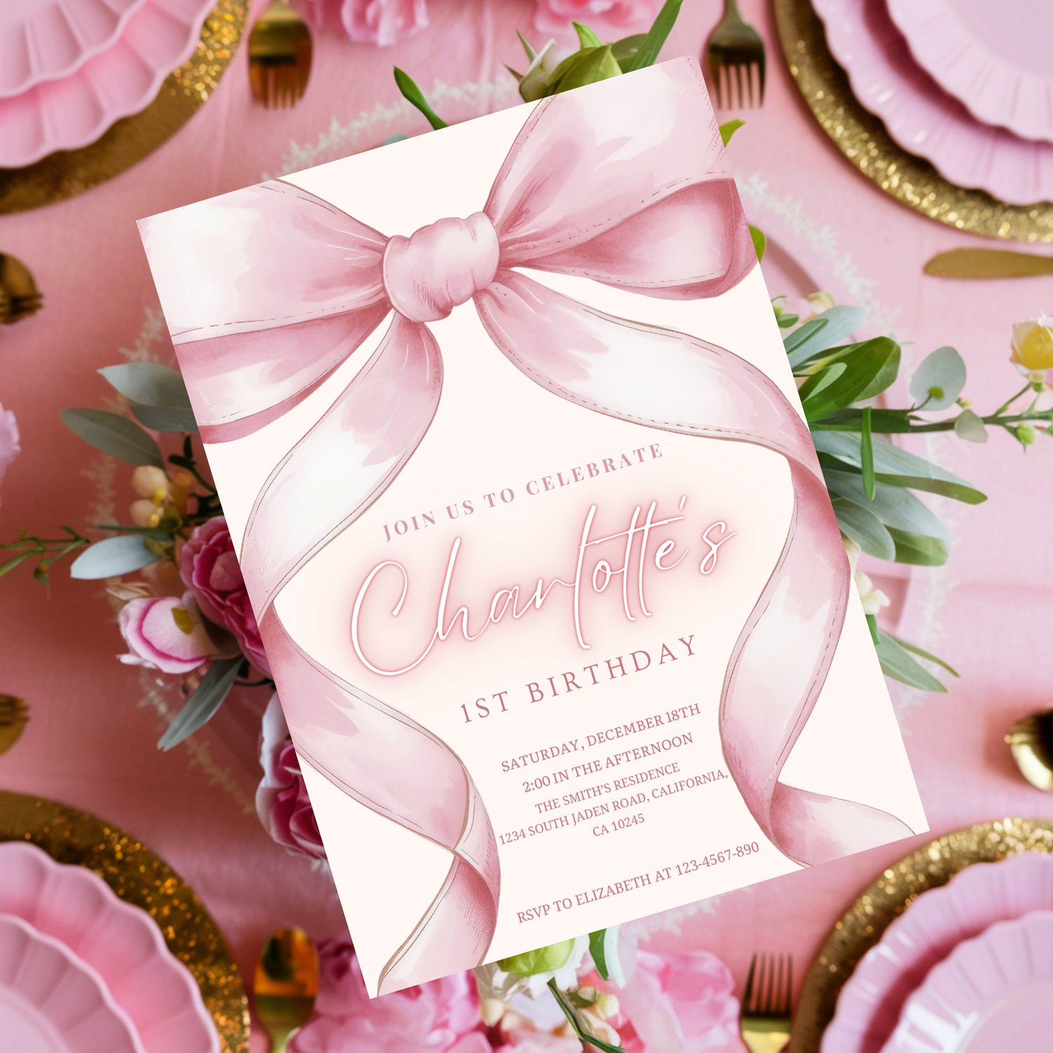 Editable Pink Bow First Birthday Template Printable, Pink Coquette Bow Invitation 1st Birthday Girl Invite, Bow Invite Bow Invite 1st bday