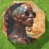This vibrant artwork showcases an African woman in a bold, futuristic style. She wears round, reflective sunglasses and large statement earrings, with her hair adorned in intricate braids. Her attire is rich with geometric patterns in bright shades of orange, blue, and red, complemented by a striking headband. The warm, swirling backdrop evokes a sense of movement and energy, perfectly blending traditional African elements with futuristic design. The image captures a powerful, forward-looking aesthetic, representing cultural pride and modernity.
