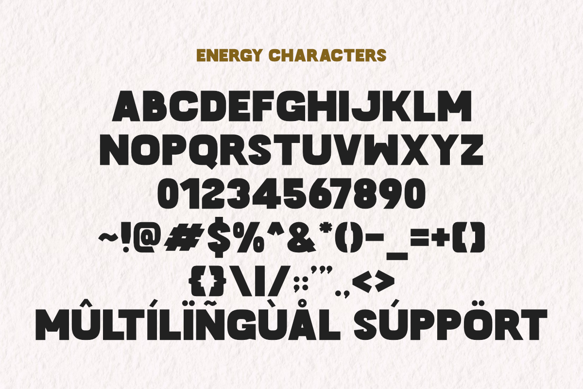 Energy is a heavy all caps sans serif font. This font is perfect for delivering a powerful statement and commanding attention in all your design projects, making it ideal for designs that require strength, impact, and a bold presence. Its robust, unwavering letterforms are designed to convey a sense of dynamism and unwavering stability, perfect for conveying a strong message. Whether you're working on striking logos, impactful event posters, creating dynamic headlines for websites, designing compelling branding for activewear, or crafting powerful social media graphics, Energy is your go-to typeface! It ensures your message is not just seen, but felt with an undeniable force and authority. Embrace its commanding presence to create designs that truly stand out and resonate with unwavering confidence.
