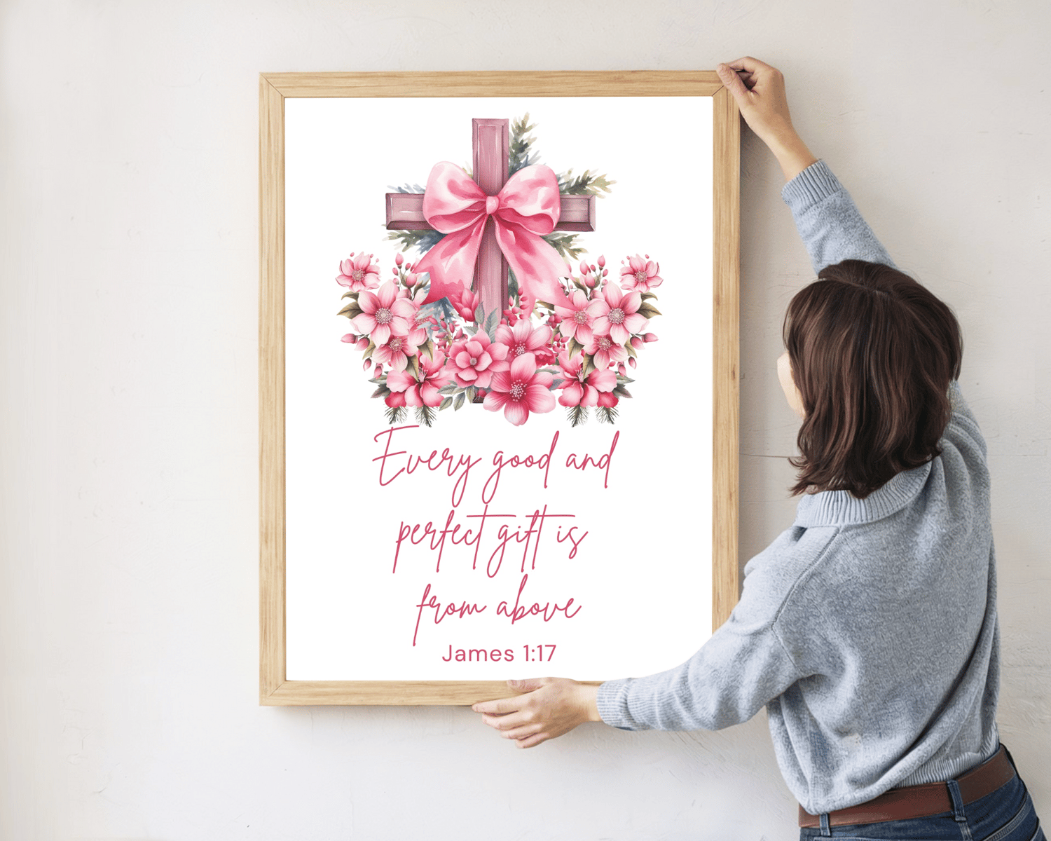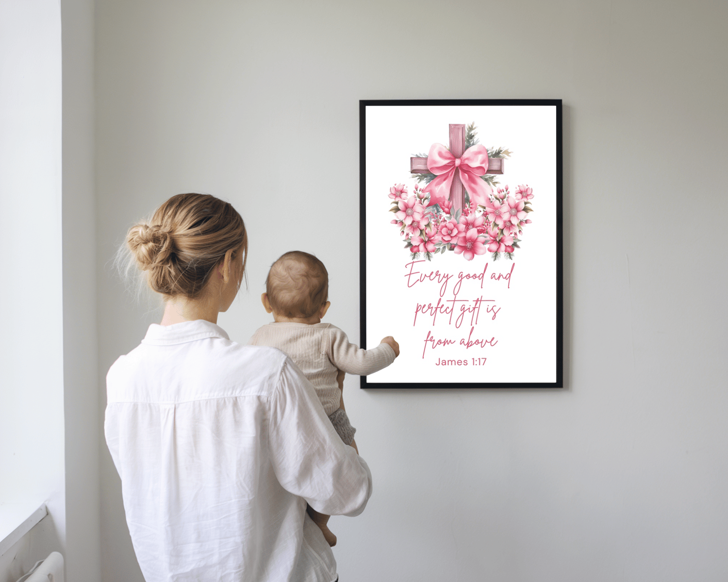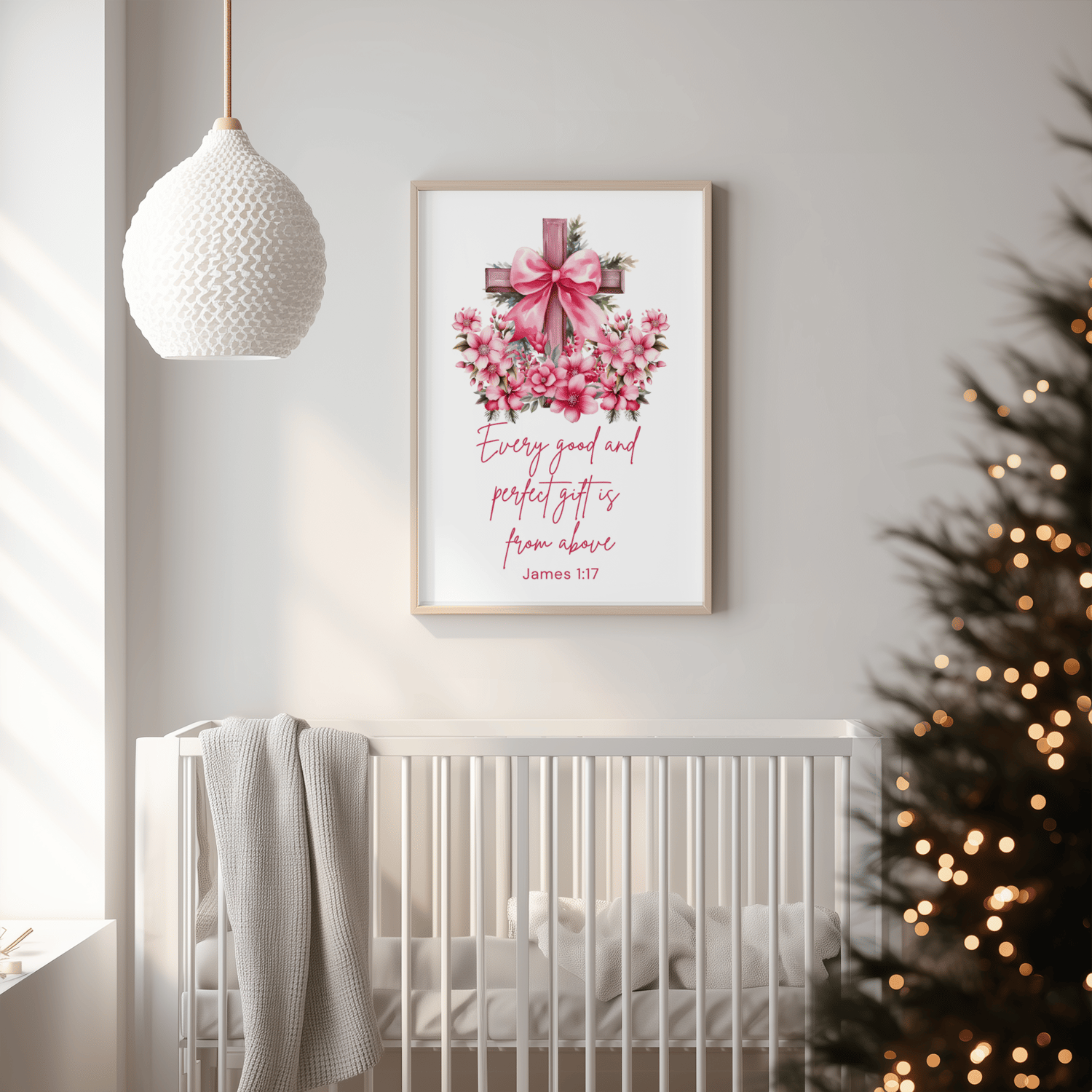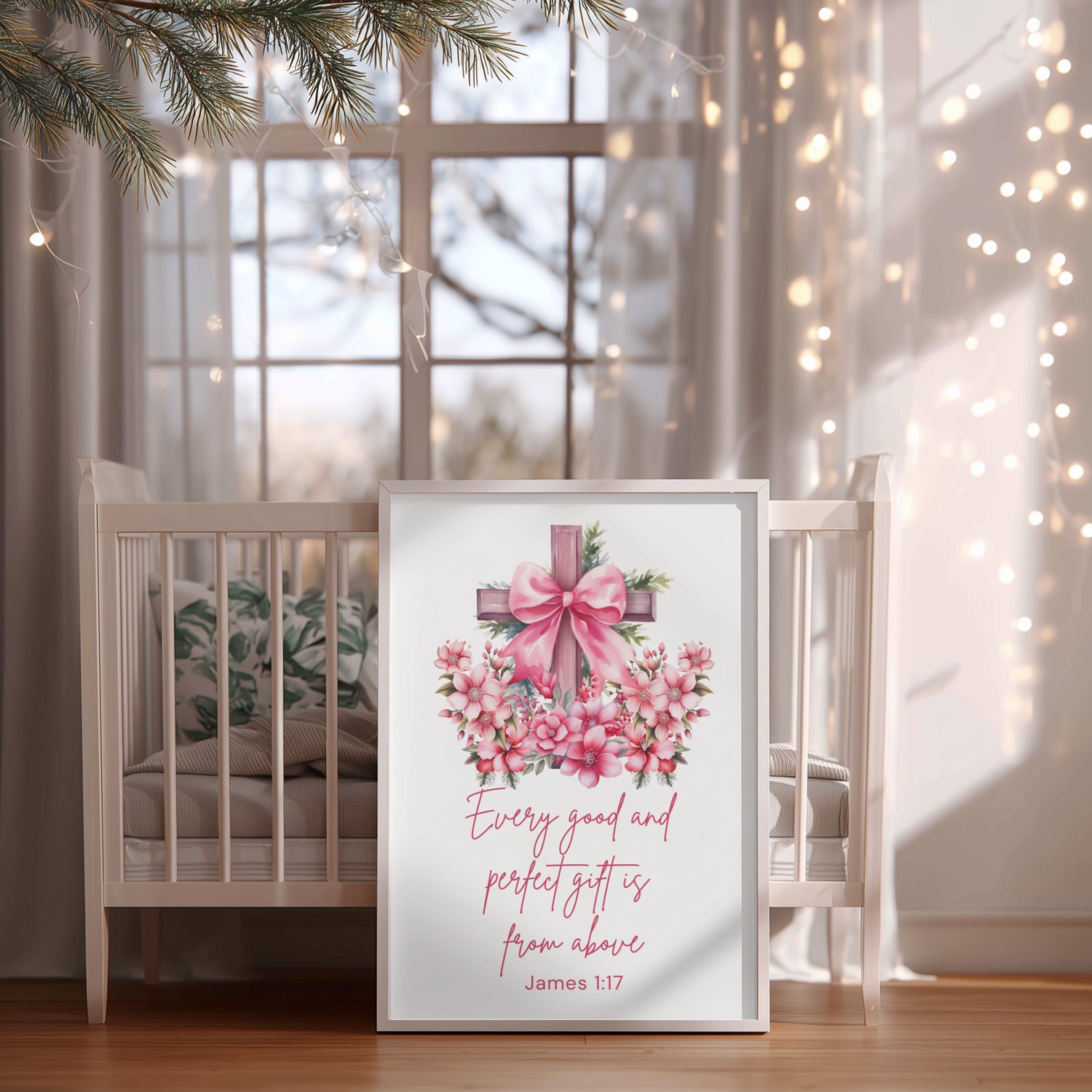 Celebrate the blessing of new life with this beautiful Every Good and Perfect Gift is From Above scripture print, inspired by James 1:17. Featuring a soft watercolor-style cross wrapped in a pink bow and surrounded by delicate Christmas florals, this Christian wall art adds a tender and faith-filled touch to any baby girl’s nursery or child’s room.