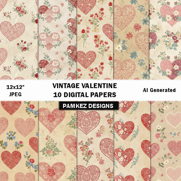 Bring timeless romance to your creative projects with this charming Vintage Valentine digital paper set. Each design blends soft textures, aged tones, and nostalgic motifs to create a warm, heartfelt aesthetic perfect for February crafting and beyond.