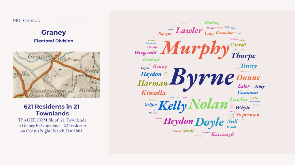 This file contains the details of all 621 residents of Graney on Census Night March 31st 1901. The 21 townlands in this Electoral District, with the number of residents in brackets is as follows: