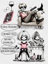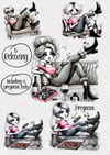 11 girls/women sofa with chocolates or dressing table, includes pregnant girl. birthday, Mother’s Day. 13 PNGs files. Sublimation, print. Monochrome apart from pink t shirt detail.