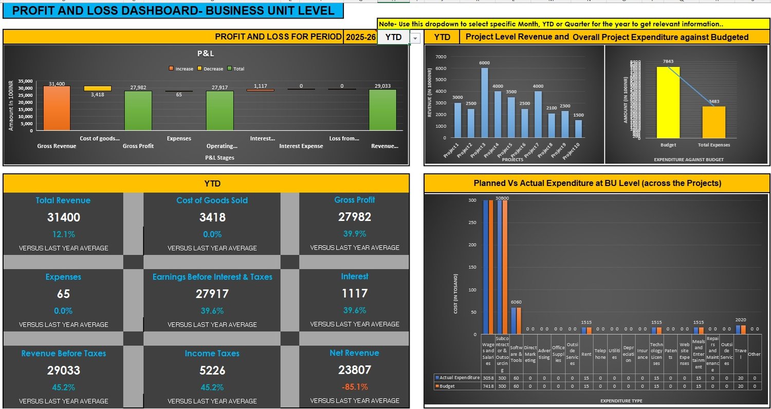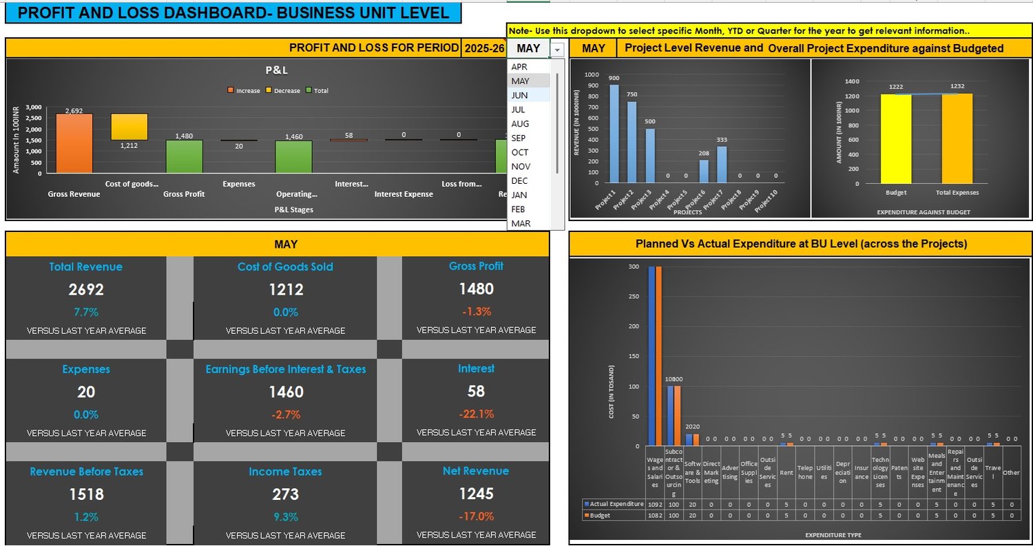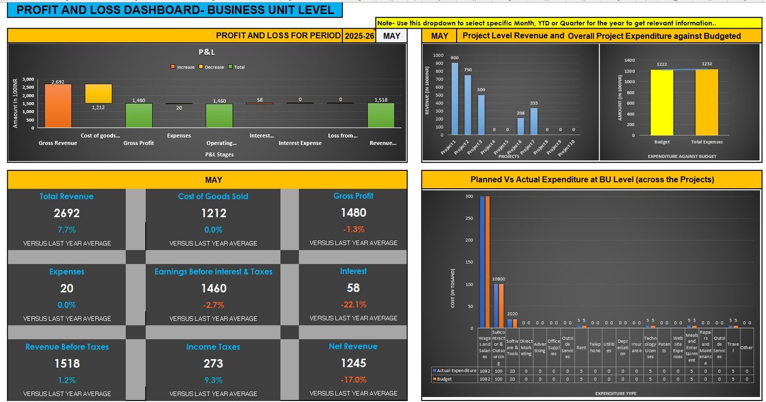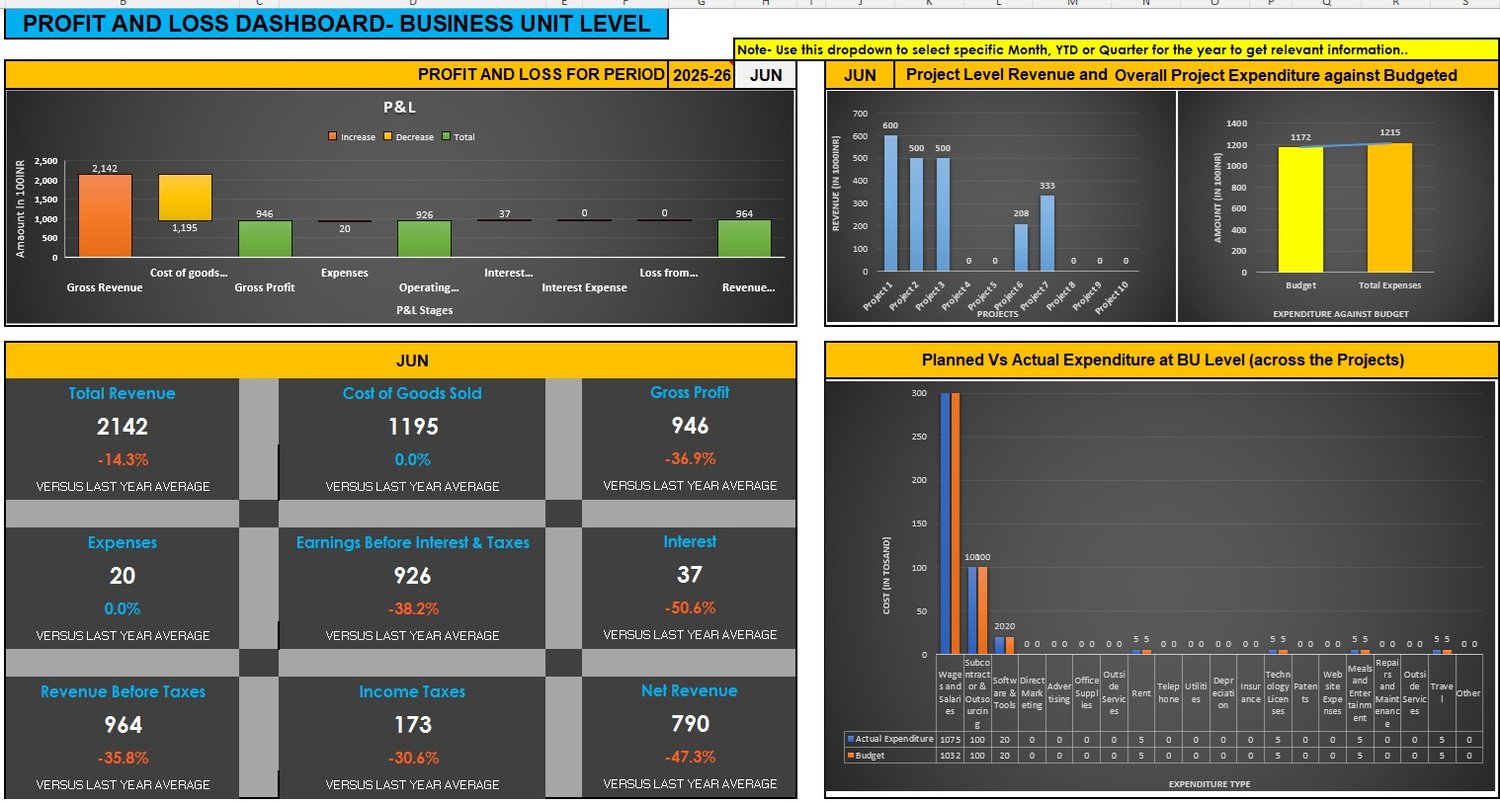 ✔ Dynamic Profit & Loss Dashboards with Monthly, Quarterly and Annual Break Up of P&L statement for respective financial year & to forecast Quarterly Budget & track expenditure within Business Unit.