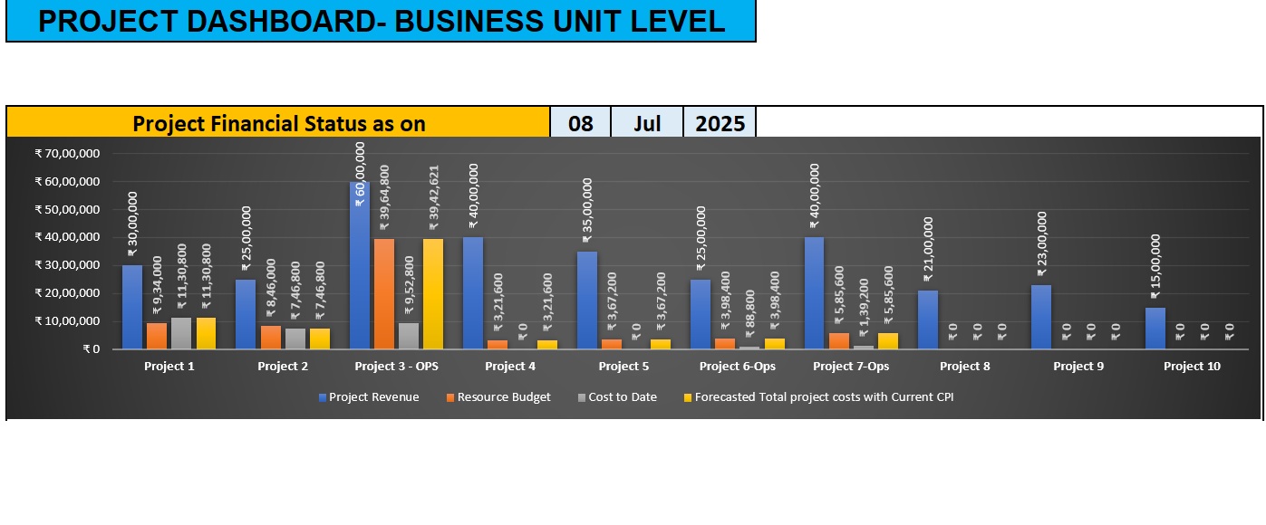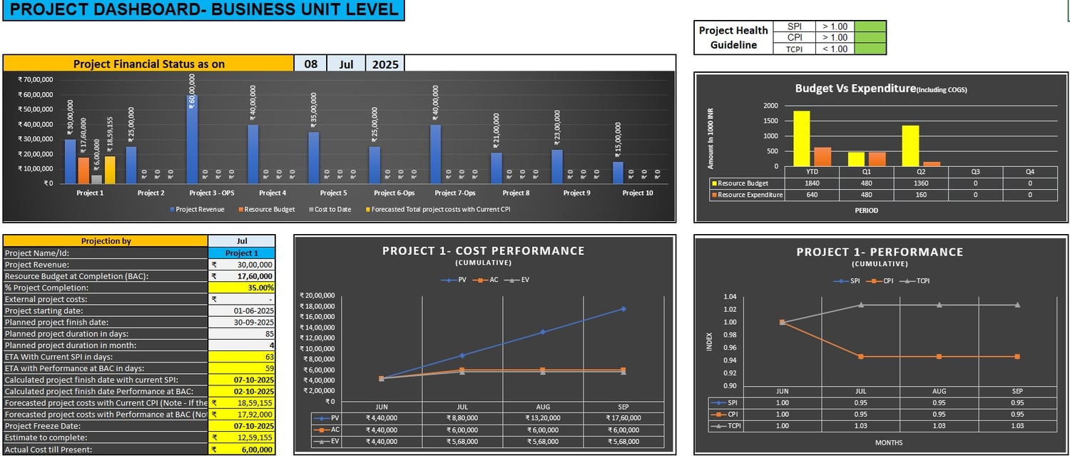 ✔ Dynamic Project Dashboard with SPI, CPI, CV, SV & Forecasts for Project & Operations running within Business Unit.