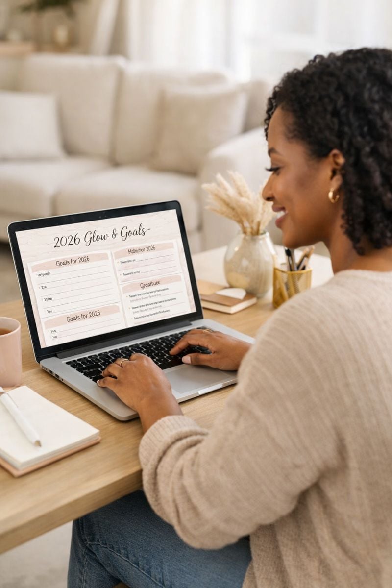 2026 Glow & Goals is a simple, printable guide designed to help women set meaningful goals, build supportive habits, and stay grounded through gratitude, affirmations, and reflection.