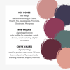 + Detailed Hex Codes, RGB, and CMYK values for each color