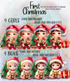 4 girls and 4 boys, each has blonde and brunette hair and blue and brown eyes. “First Christmas” text included as a separate file, in Sunshine font.