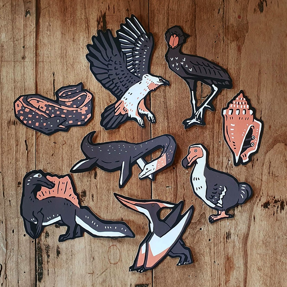 Four extant species: The bearded vulture, the shoebill, the florida fighting conch and the mediterranean moray; as well as four extinct species: the dodo, pteranodon, spinosaurus and styxosaurus.