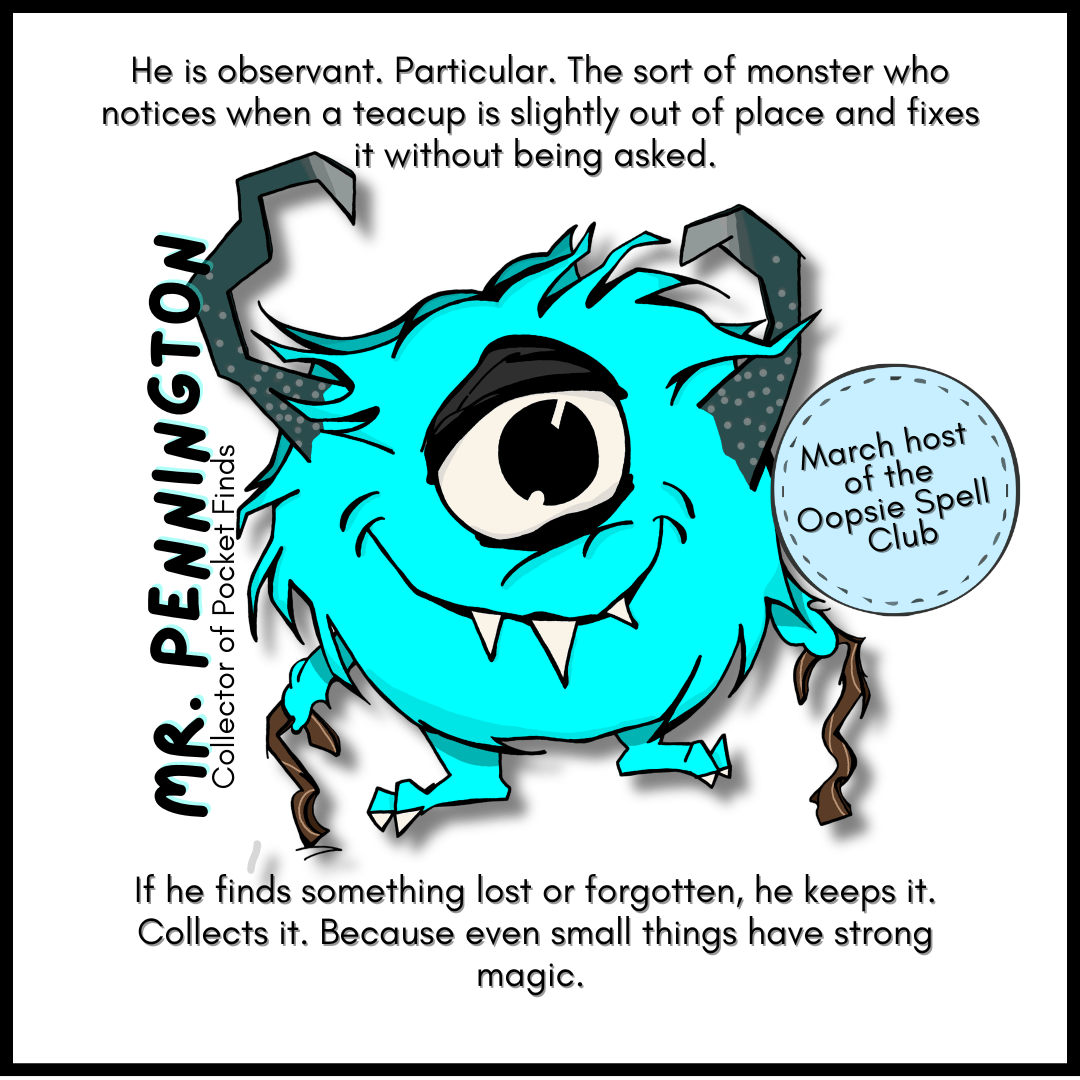 Mr. Pennington is known around the Monster Emporium as the collector of pocket finds. The small wonders others walk past. A smooth stone, a feather, a curious button, a leaf shaped like a tiny heart.