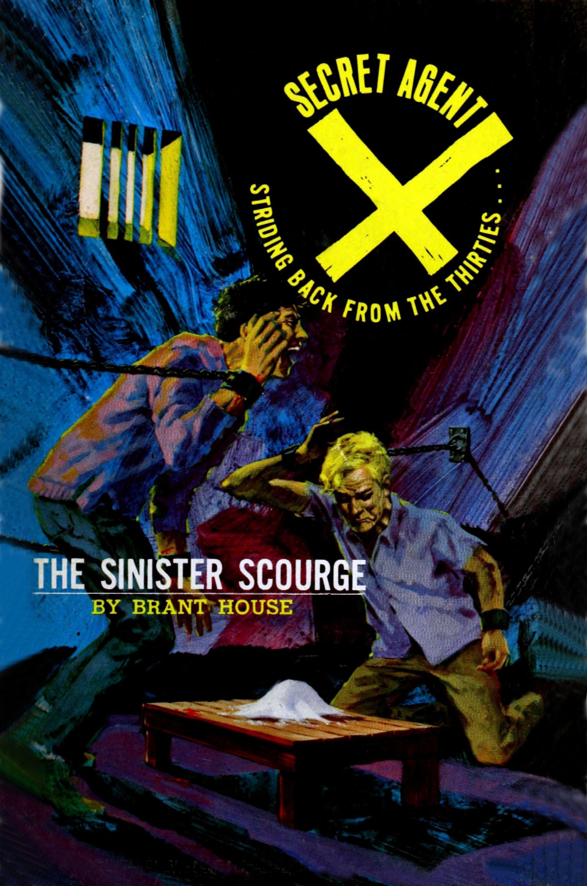 Flaming phosphorous frustrated and imperiled the supersleuth, Secret Agent X, wherever he turned in his search for the dire criminal mastermind whose gigantic narcotic ring threatened to enslave the nation. All X's genius at disguise and subterfuge seemed impotent against the baffling plot of the Sinister Scourge.