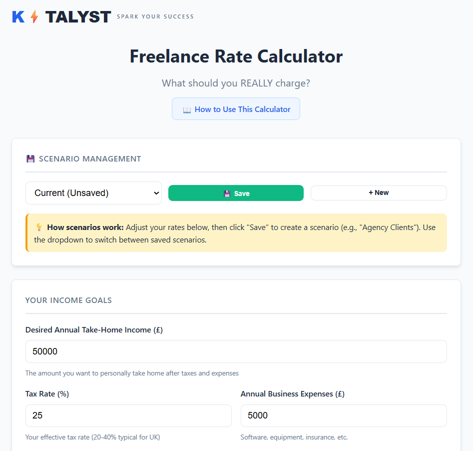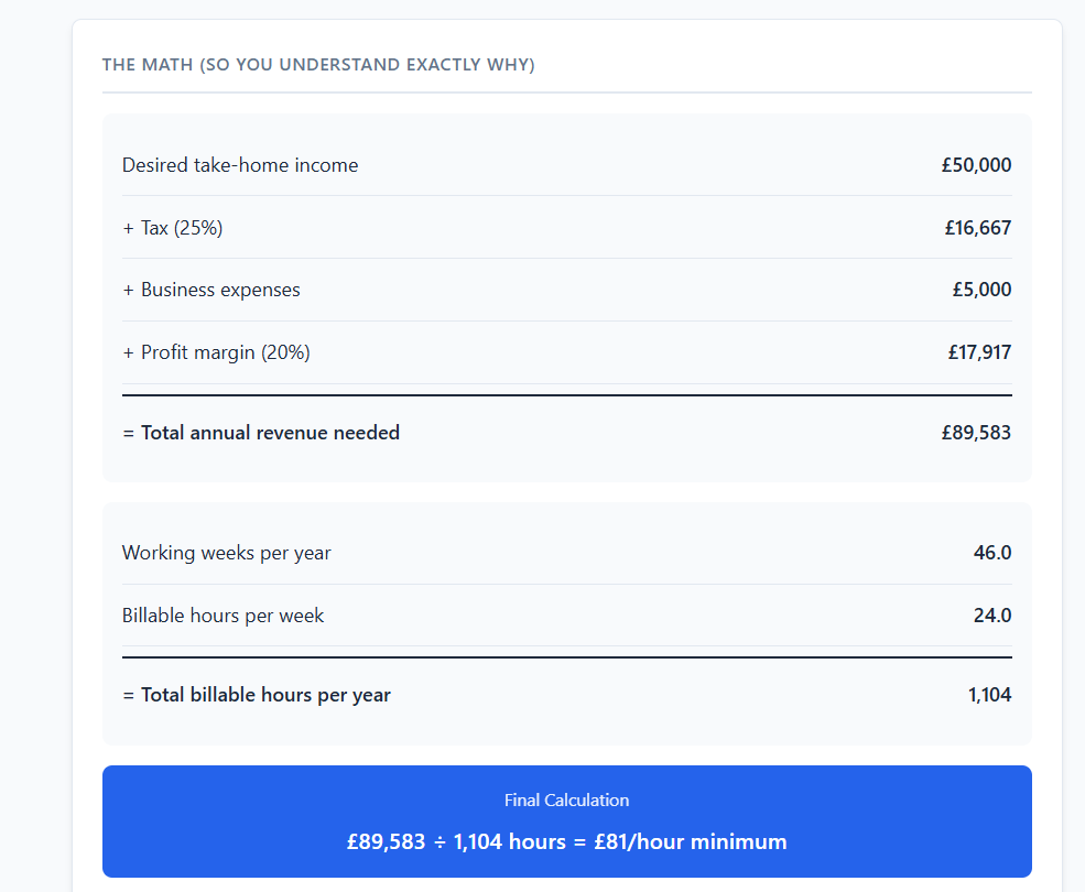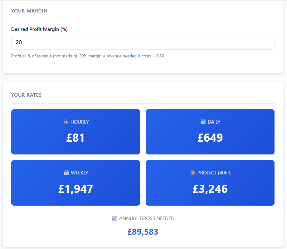 Stop guessing what to charge. Enter your costs, goals, and working hours — get your perfect hourly, daily, and project rates in seconds.