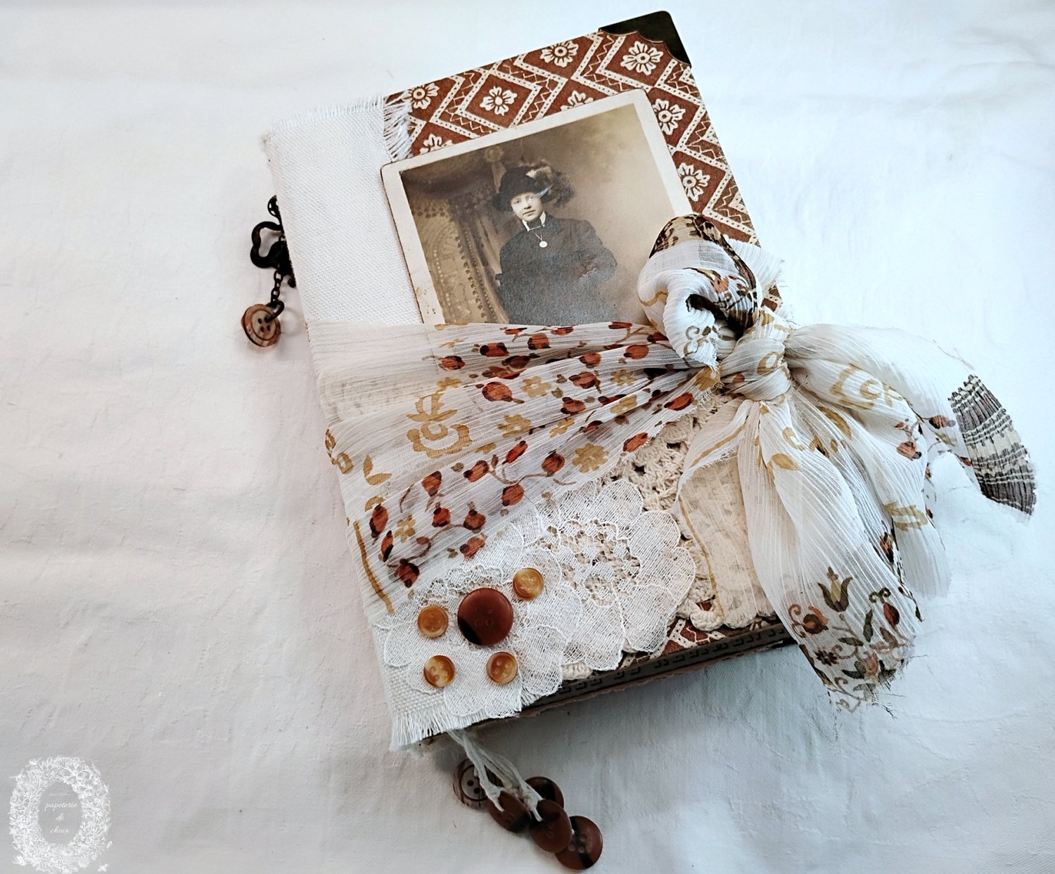 Hat & Muff Girl is a journal made from a vintage book with the original cover that has 146 writing pages, 4 tags, 41 pockets/tucks, 26 journaling cards, 4 special ephemera, 5 signatures, measures 7.75 inches tall x 5.5 inches wide x 2 inches thick, and features an authentic antique photo postcard inside a pocket made from a vintage crocheted doily on the cover.