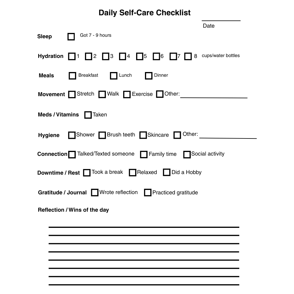 A simple, ADHD-friendly self-care checklist to help you stay on track with daily habits. Includes sections for sleep, hydration, meals, movement, hygiene, meds, connection, downtime, and gratitude, plus space for notes and reflection.