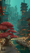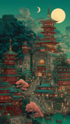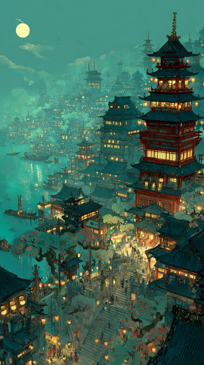 Experience “Kinshō”, a breathtaking vertical artwork blending the ethereal elegance of WLOP, the Art Nouveau beauty of Alphonse Mucha, and the timeless charm of traditional ukiyo-e with a modern cyberpunk twist. This hyper-detailed composition depicts a futuristic Japanese megacity where massive golden skyscrapers pierce emerald-teal misty skies, floating moons and stars hover, and traditional red pagodas and glowing lanterns nestle among layered cyberpunk districts.