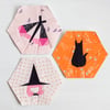 The designs were inspired by the Spooky 'n Sweeter fabrics and blend in beautifully! All of the mock ups and sample blocks were made using Art Gallery Fabrics and the names of the fabrics used are in the pattern.