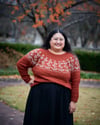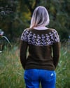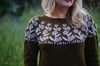 Brown sample is size 12 on a 50″ / 125 cm chest circ, demonstrating a positive ease of 2″ / 5 cm. Yarn is Less Traveled Yarn Arcadia DK in the colorways Sedona (MC) and Fluorite (CC).