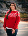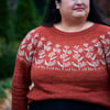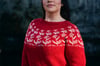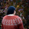 Red sample pictured is size 9 on a 44” / 110 cm chest circ, demonstrating a positive ease of 2” / 5 cm. Yarn is Serendipitous Wool Agni DK in the colorways Fabulous (MC) and Milkweed (CC). Both samples use the back lengthening option.