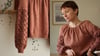 The blouse has a relaxed, slightly oversized fit with a bit of exaggerated wide sleeves. Both body and sleeves are worked top down in the round and gathered at the hem/cuffs. There is also an option to finish the body with a folded hem with picots.