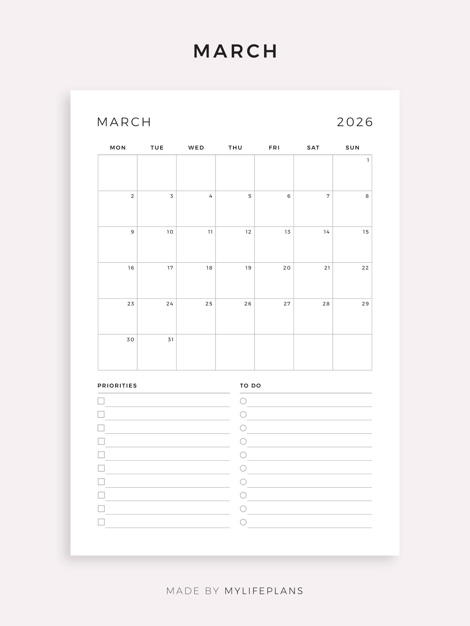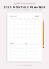 This is a printable 2026 monthly planner — just download, print, and start using it right away.