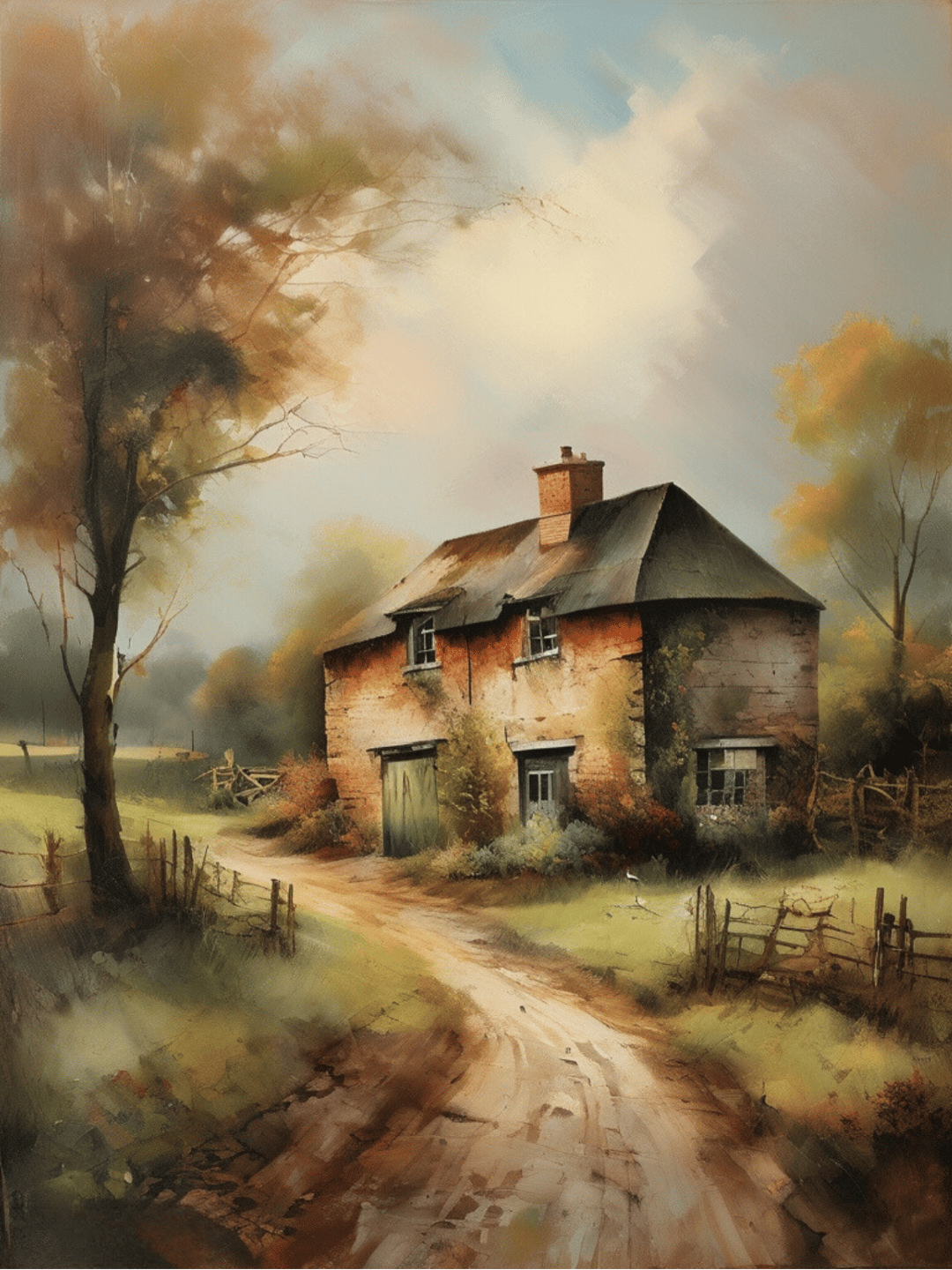 The old British countryside, a work of wall art dating back to 1960, with all its details and colours. The farm is an old oil painting in faded oil colours.png