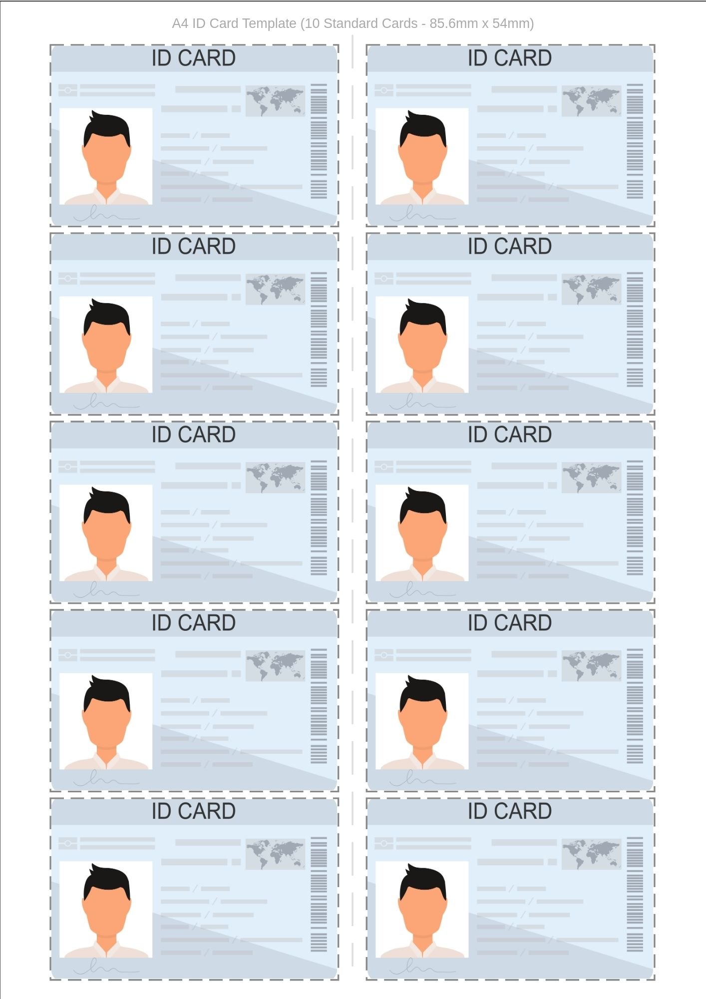 Stop wasting paper and time trying to align your ID cards manually. This professionally designed Canva template allows you to print 10 Standard Size ID Cards on a single sheet of A4 paper. It comes with accurate cutting guides, making it perfect for office, school, or event use.