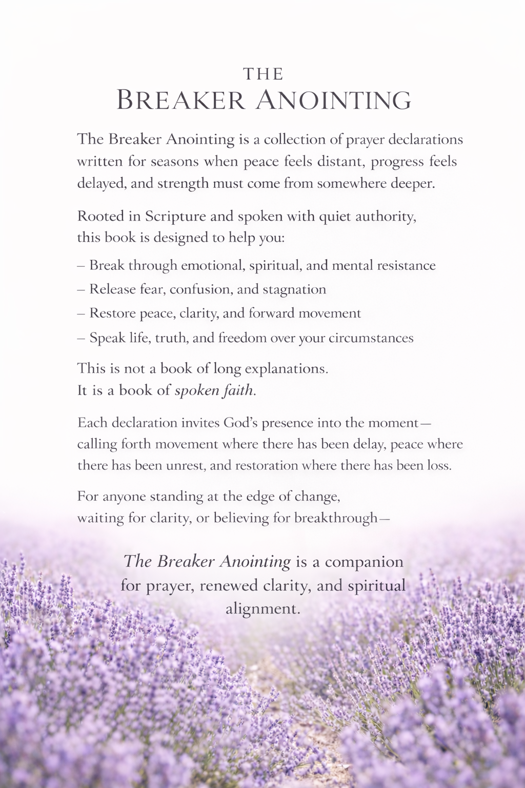 Rather than long explanations or teaching chapters, The Breaker Anointing offers prayers meant to be spoken aloud. The declarations address themes such as protection, restoration, wisdom, peace, healing, provision, authority, miracles, and breakthrough. Short emergency prayers are also included for moments when words feel difficult to gather and strength is needed quickly.
