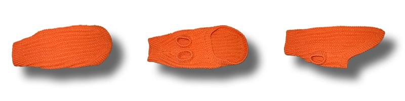 Finished sweater measures: Length: 17”, Chest 16”, From the top of neck to leg openings: 5”, space between legs 1 1/2”.