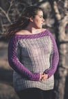 Knit this lovely pullover from the bottom up – then cast on a series of stitches on each side to form sleeves. Coordinating rib and lace patterns add panache, set off by the contrast between two gorgeous handdyed colorways.
