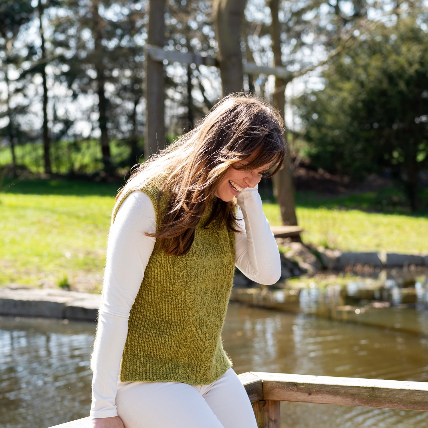 “With long lines of branches leading to a rich canopy of leaves, my vest design combines texture and cables to evoke the feel of the majestic trees surrounding you whilst walking through the forest.