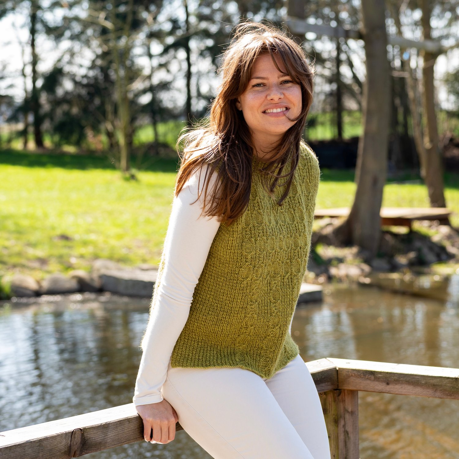 Sample shown is knit in colourway Tiddy Brook. Elisa wears a size 3 with 13.75 cm / 5.5” of positive ease.