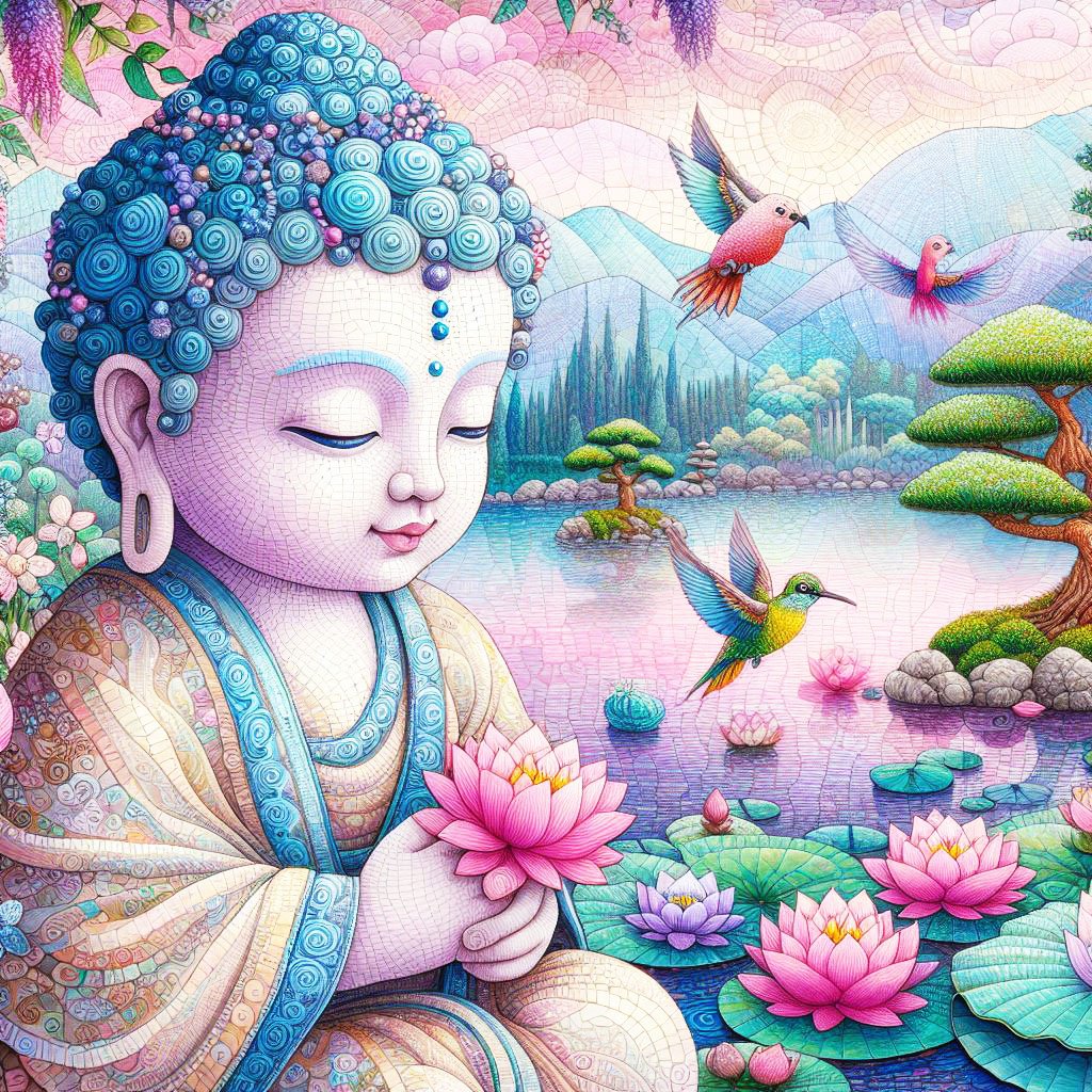 A beautiful child Buddha beside a purple lake with humming birds, trees, lotus flowers & mountains. This picture has a Mosaic effect.