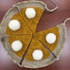 This knit pumpkin pie garland is a great way to express your love for fall! These are knit flat, one piece of pie at a time, with attached pompom whipped cream peaks. Pie pieces are then secured to each other to create the garland.