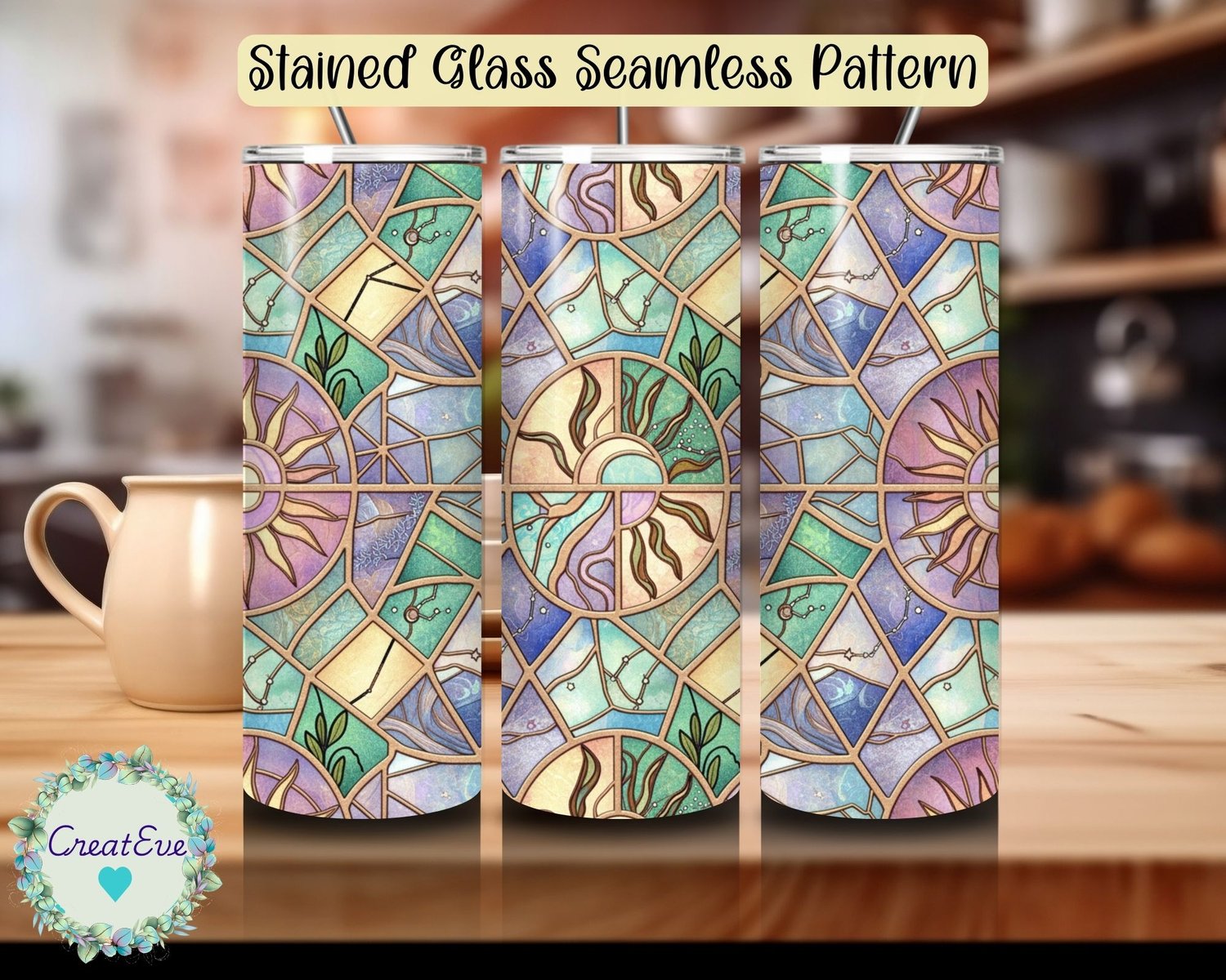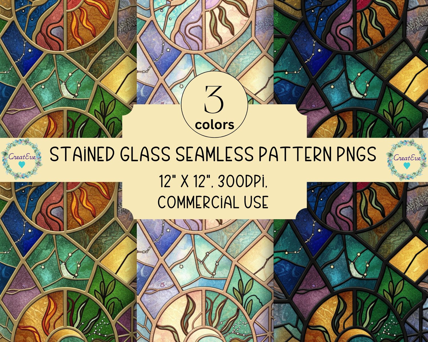 Celestial Stained Glass Seamless Pattern 3 Colorway PNG Bundle, 12" x 12", 300dpi