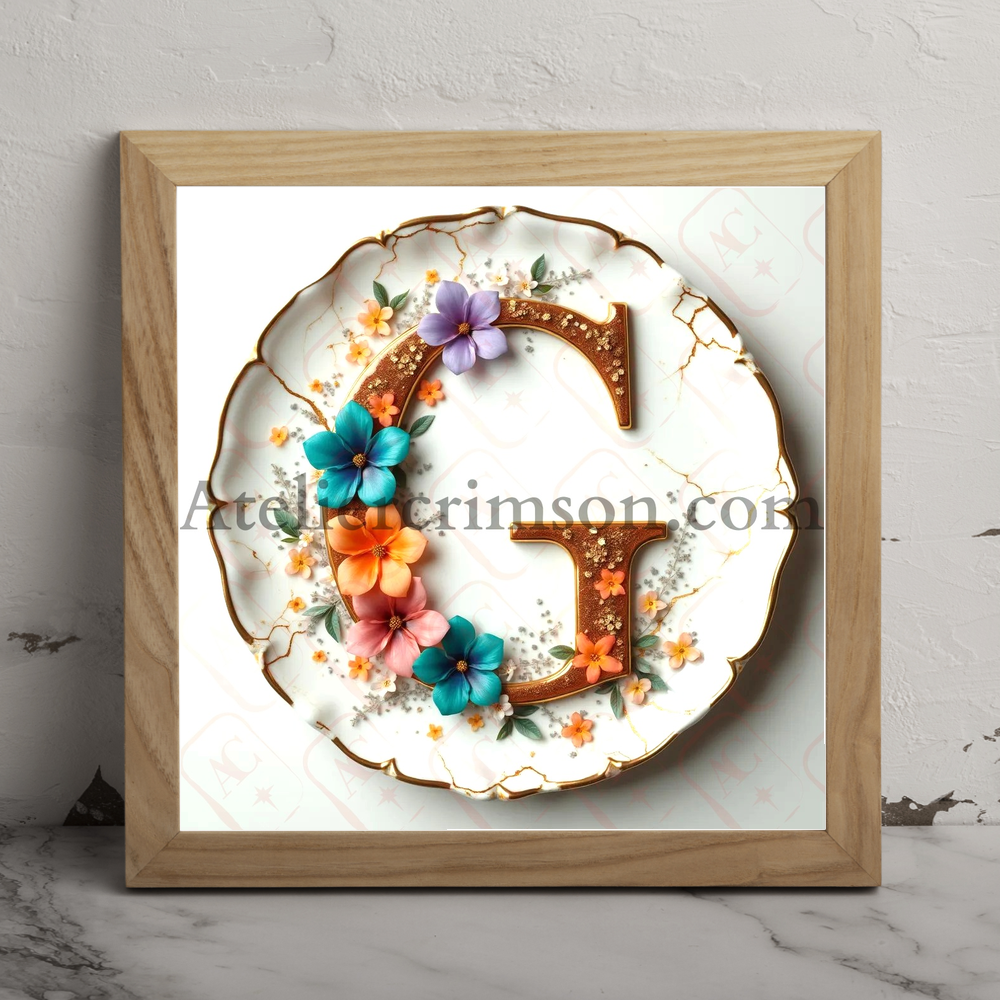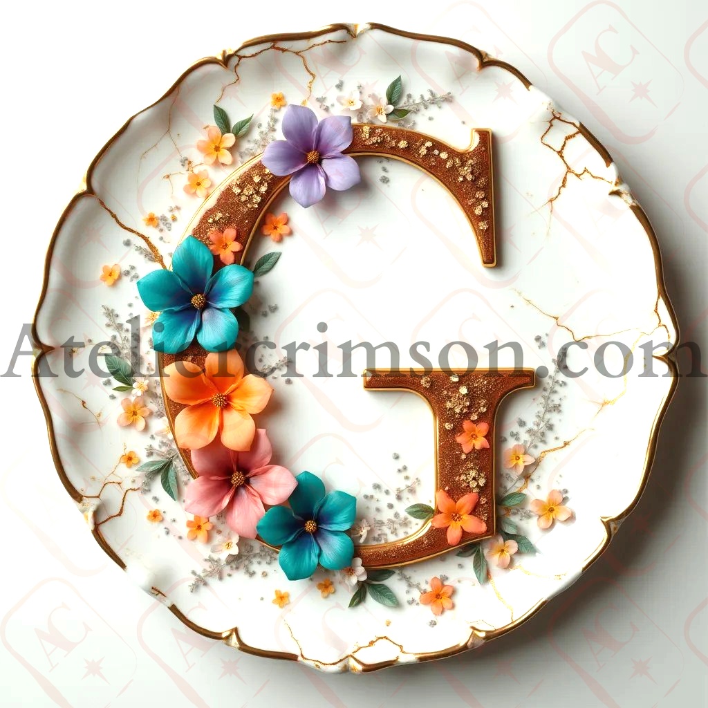 The letter G flowers and procelaine .Download Now this high quality AI-generated image, perfect for adding a touch of tranquility and creativity to any space.