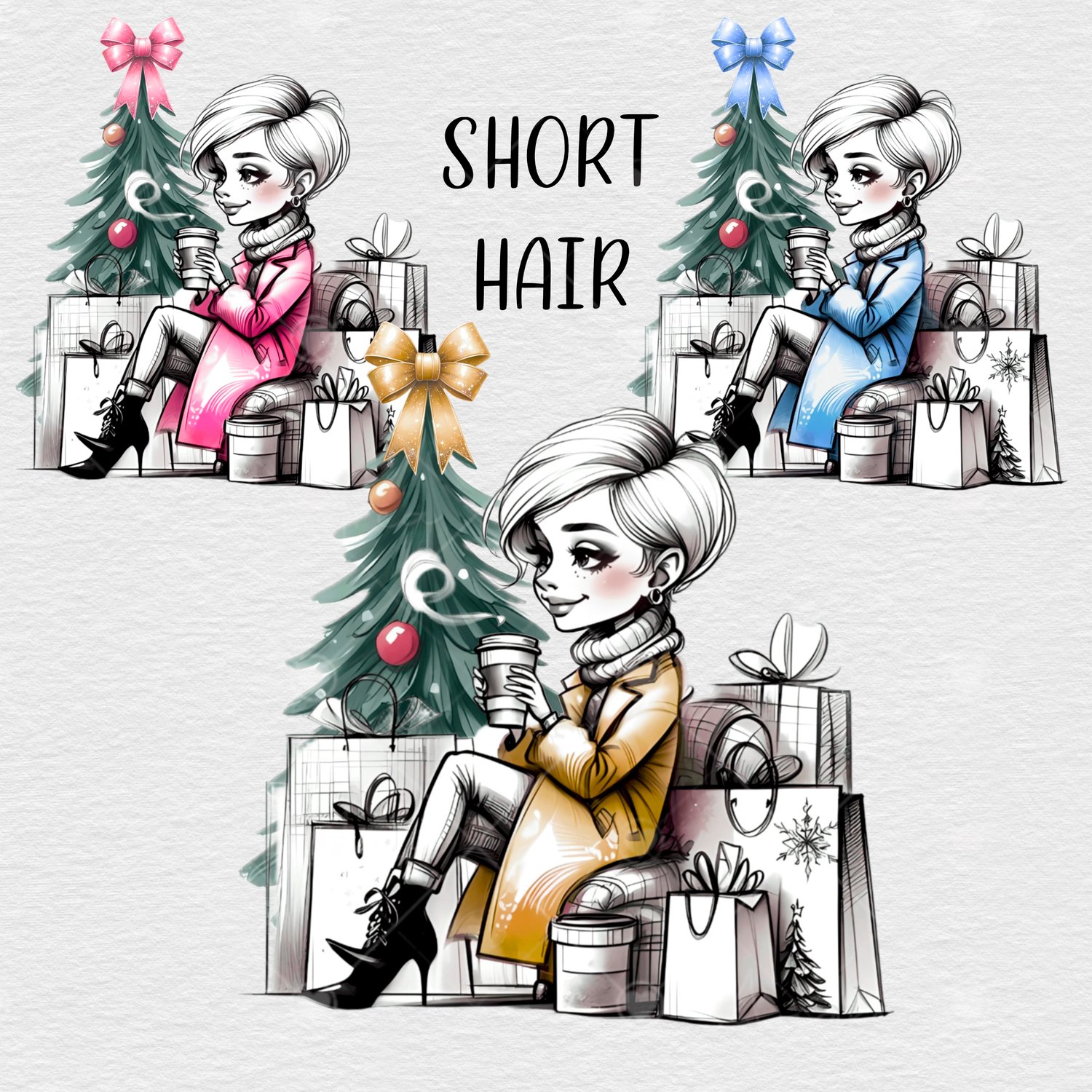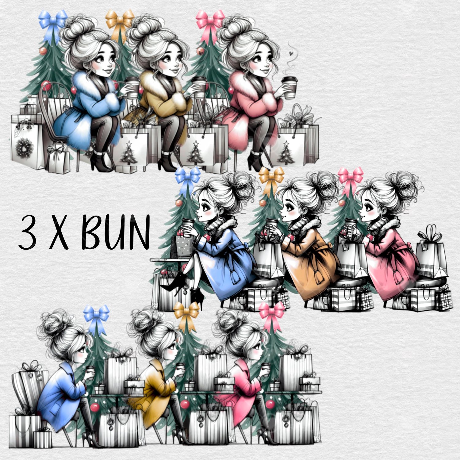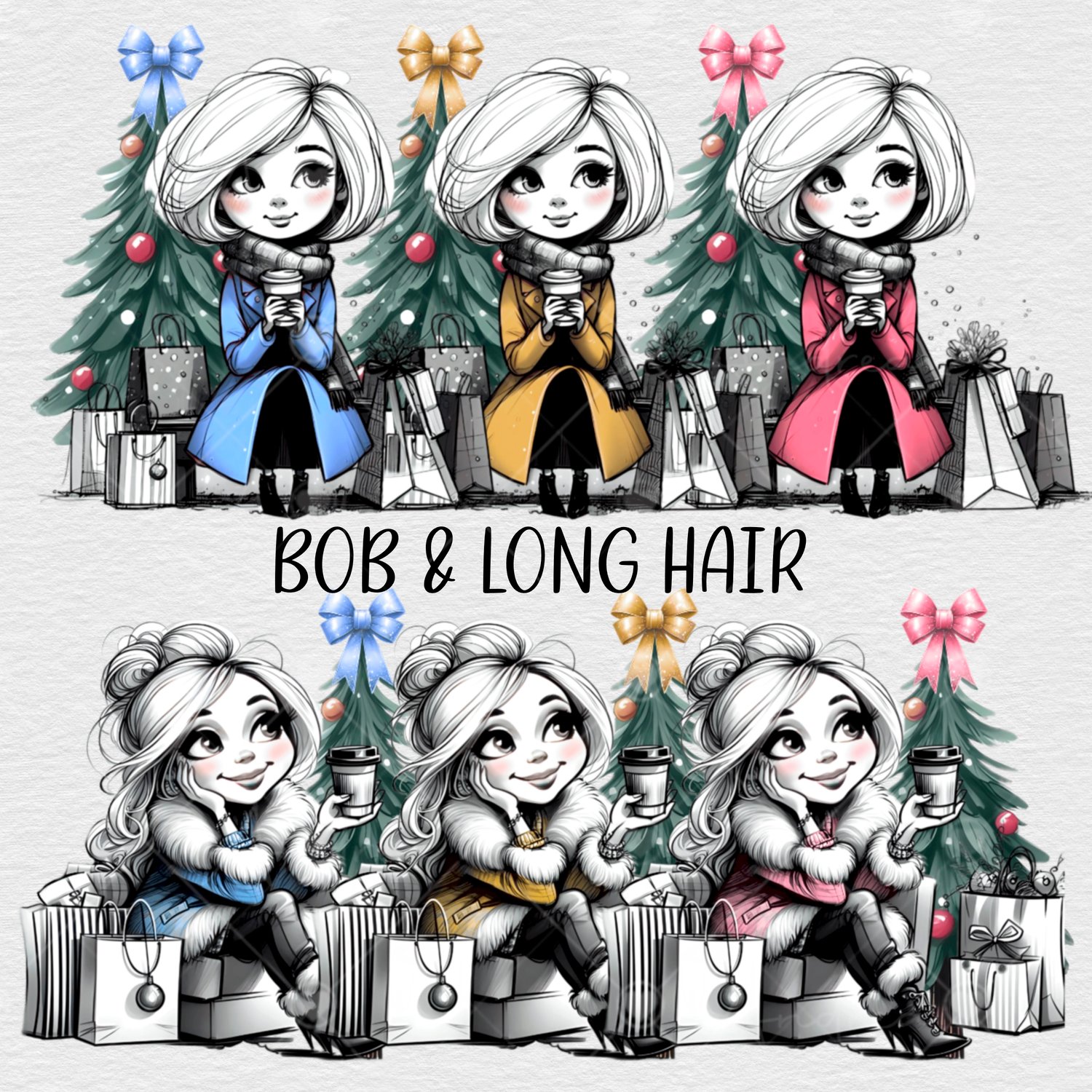 Christmas girl, 24 PNGs, 8 girls, 3 colour options for coat and Christmas tree; pink, blue, gold. Sublimation, print, DTF etc Christmas PNG. Instant Download.