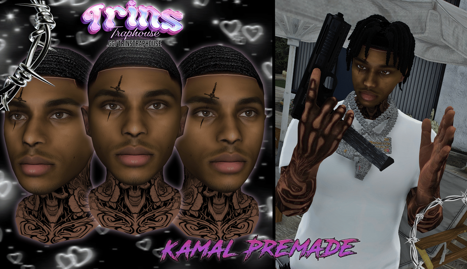 Tired of the bland FiveM faces? The Traphouse has you covered with this fully custom FiveM Ready Skin! We can’t wait to improve your FiveM Avi and Content! Once you purchase you will be emailed a download and you will also be prompted to download your file at checkout! Thanks for your support! xoxo - TrinTheDev