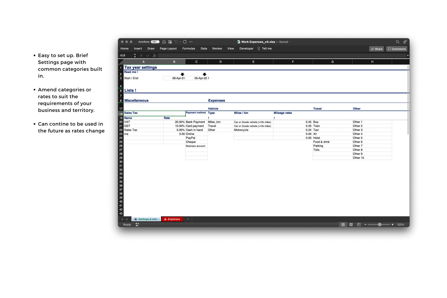 The categories and mileage rates included are current for the UK tax authority. These can easily be amended to reflect the requirements of your territory.